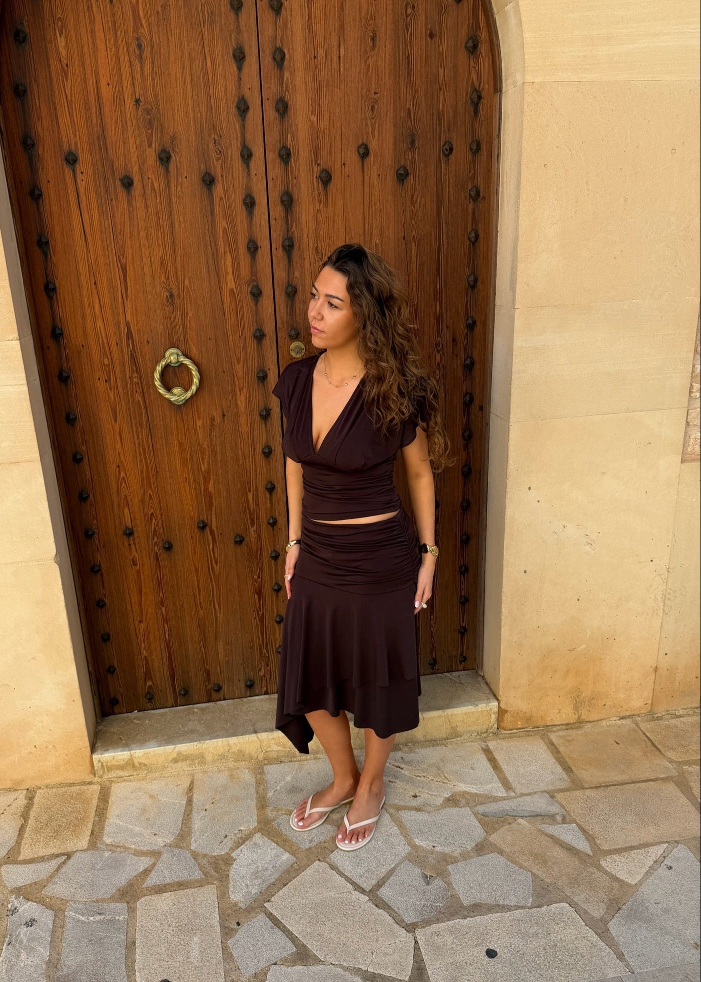 Vores Gaia Top er en let og feminin top med flowy korte ærmer. Derudover har den en dyb v-udskæring ved brystet og en åben ryg, som giver toppen et feminint look. Toppen er lavet i et blødt og elastisk materiale, som gør toppen både behagelig og nem at style. Perfekt til varme dage - både til hverdag og sommerlige anledninger🤍