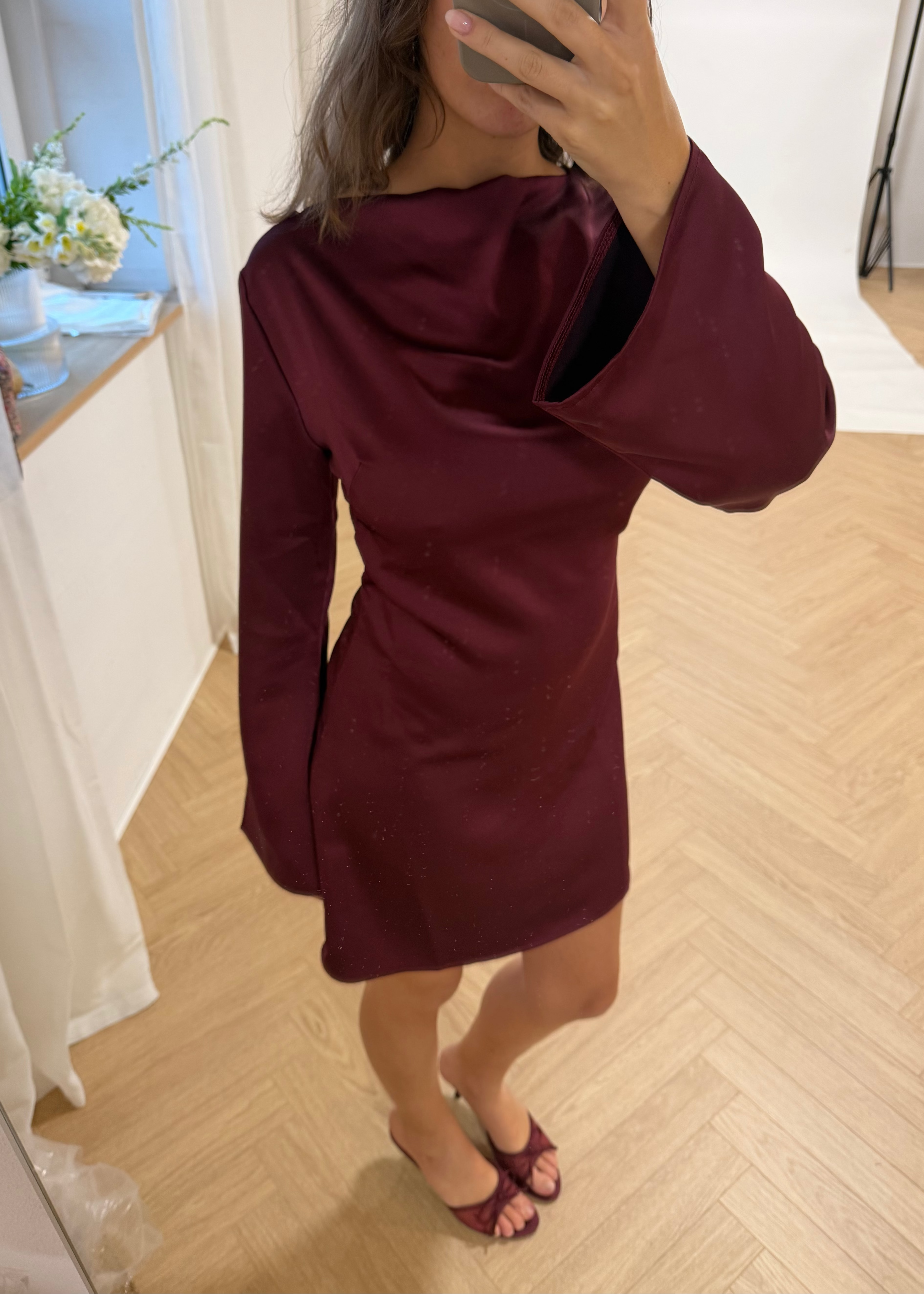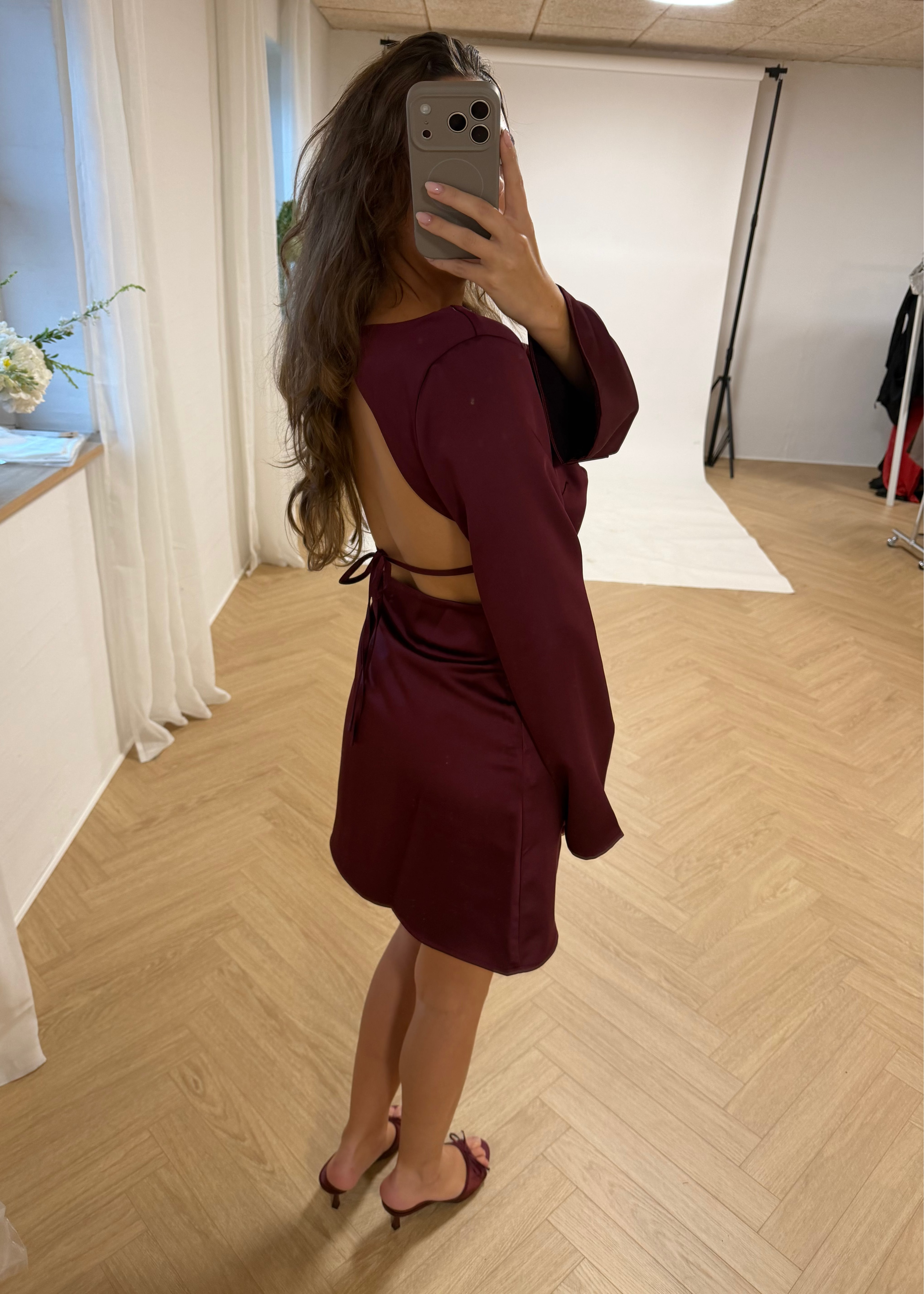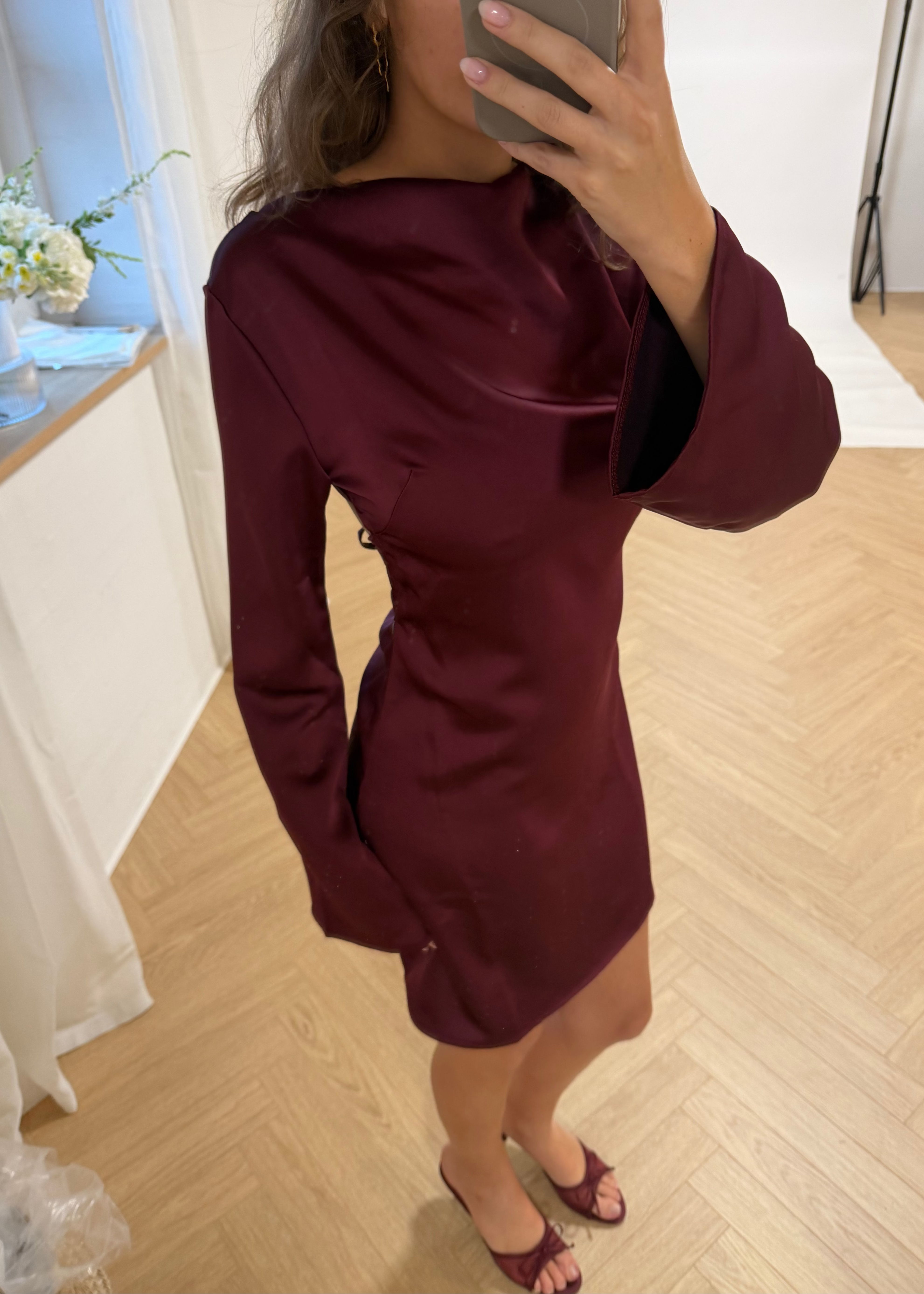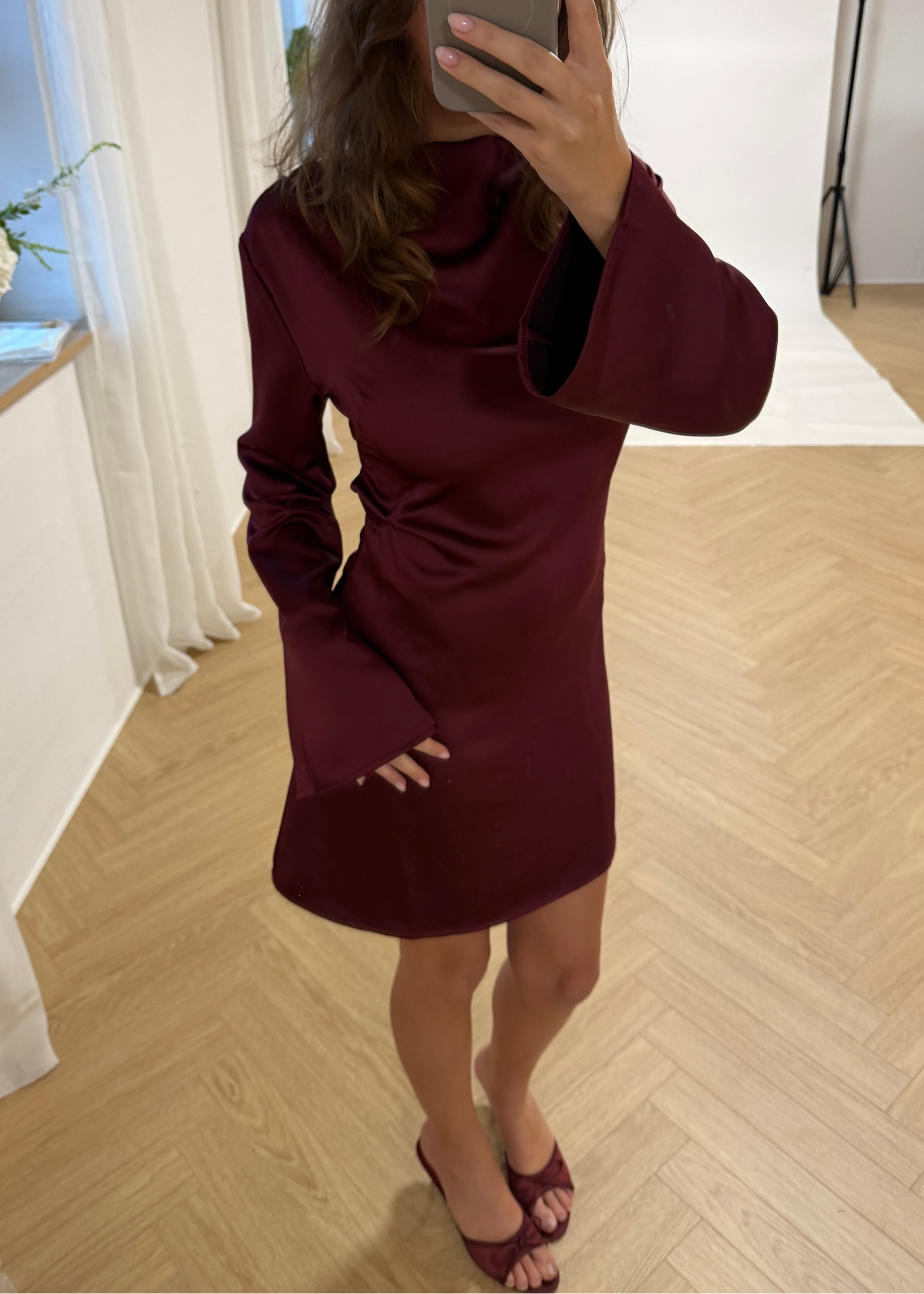 Vår eleganta satinklänning når mitten av låret och har en öppen rygg. Dessutom har den långa, lösa ärmar som ger en feminin look. Den faller vackert på kroppen och är supersmickrande i det mjukaste satinliknande materialet. Klänningen passar perfekt till jullunch, nyårsafton eller andra festliga tillfällen🌟