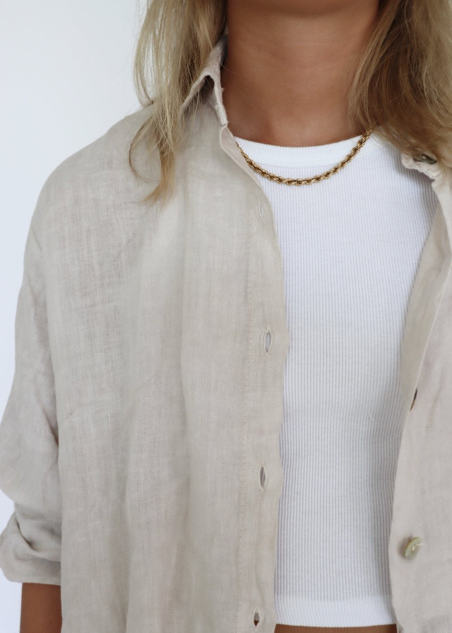 Den fina linneskjortan är gjord av 100% linne och har knappar hela vägen ner. Skjortan kan därför bäras både stängd och öppen☀️