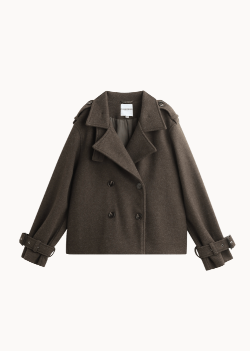 Vores nye Oline Kort Coat er en kort frakke i uldlook med dobbeltradet lukning og klassiske trench-detaljer. Med bred krave, spænder ved ærmerne og skulderstropper får du et sofistikeret men moderne udtryk. Den brune farve gør jakken perfekt til efteråret og vinteren🤎🍂