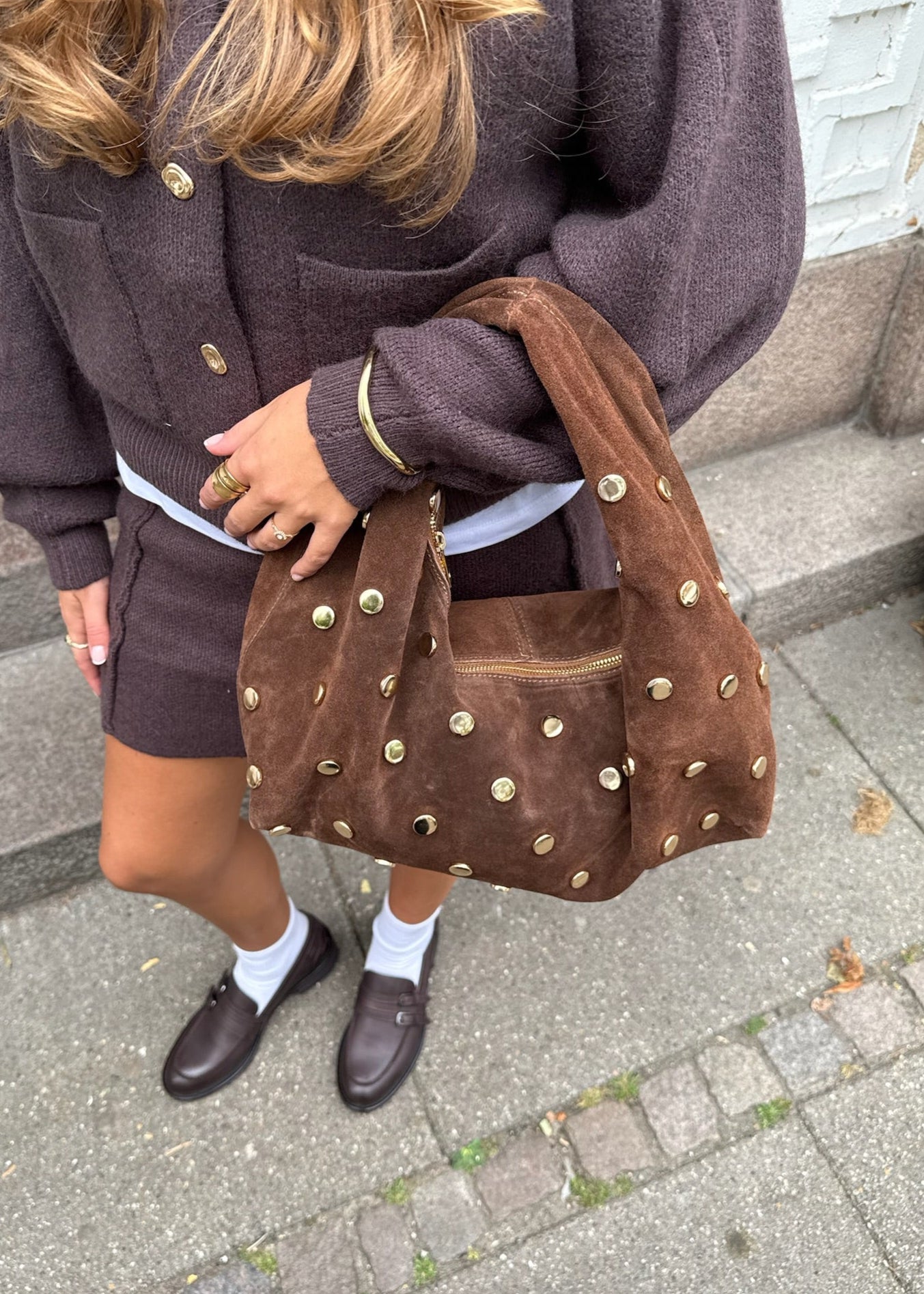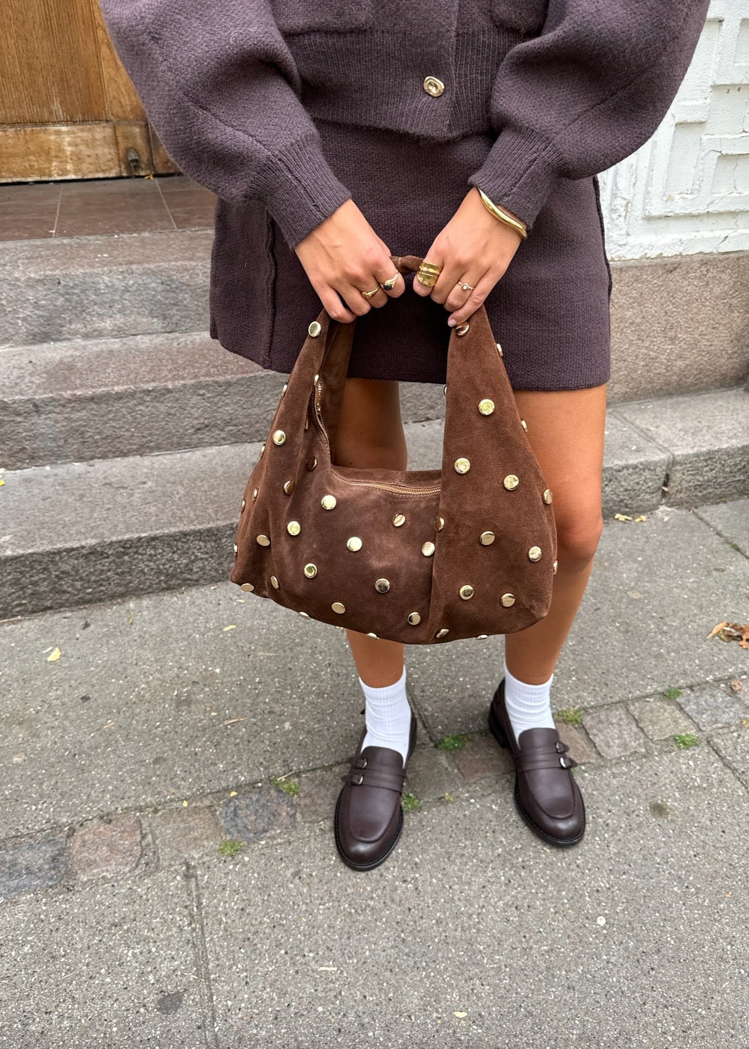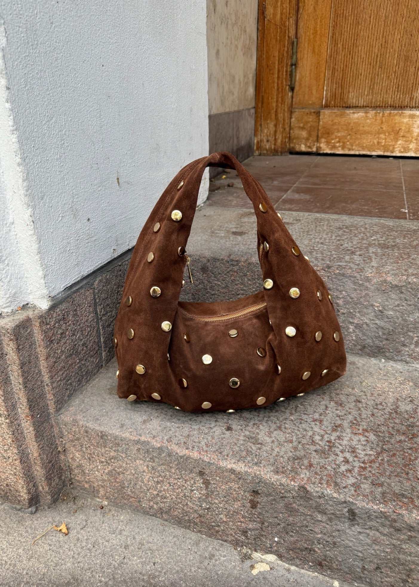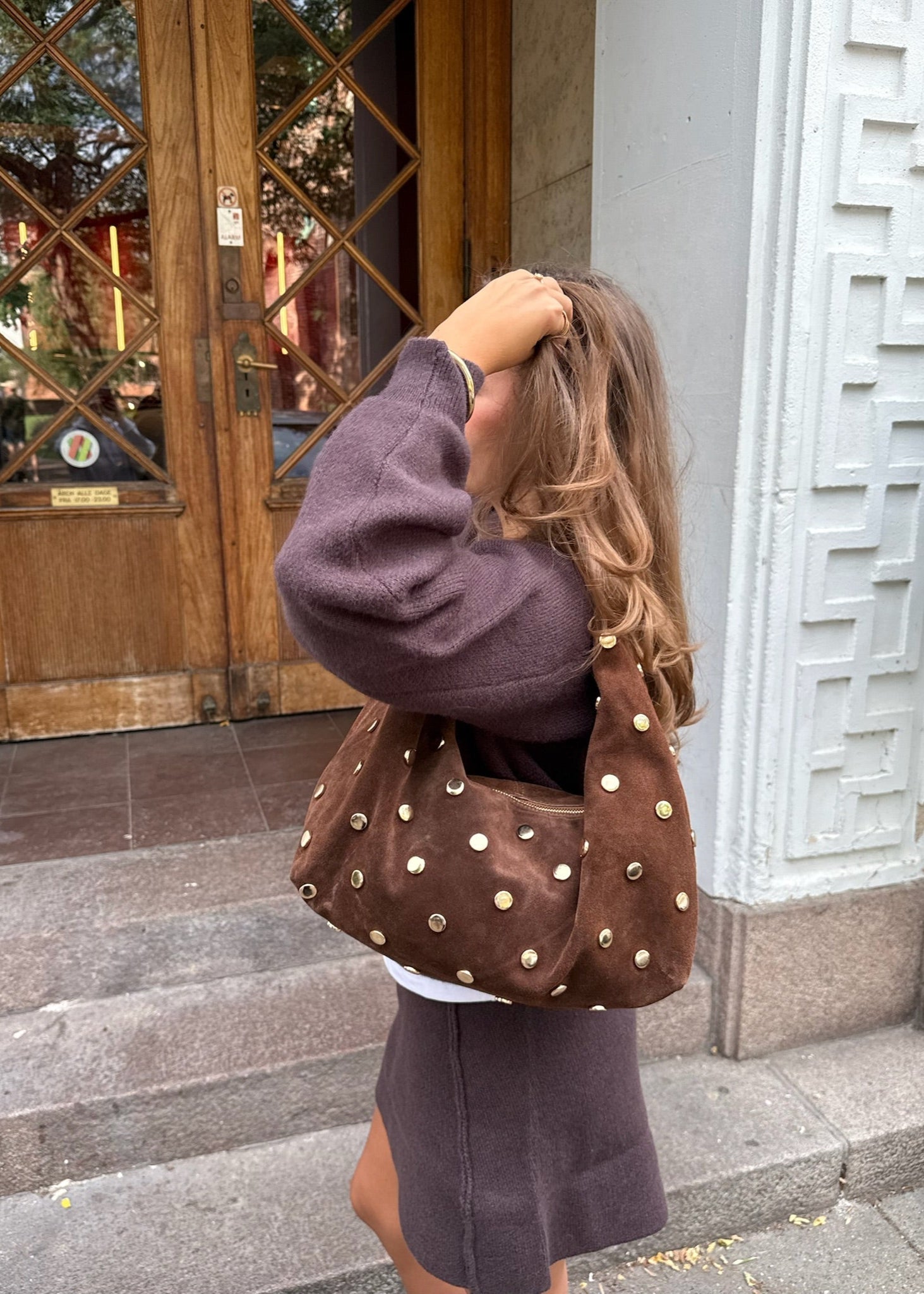 Siena Taske Med Nitter er en medium skuldertaske i blødt ruskind med dekorative guldfarvede nitter. Tasken har en rummelig form med lynlåslukning, indvendig lynlåslomme og brede stropper, der gør den behagelig at bære.