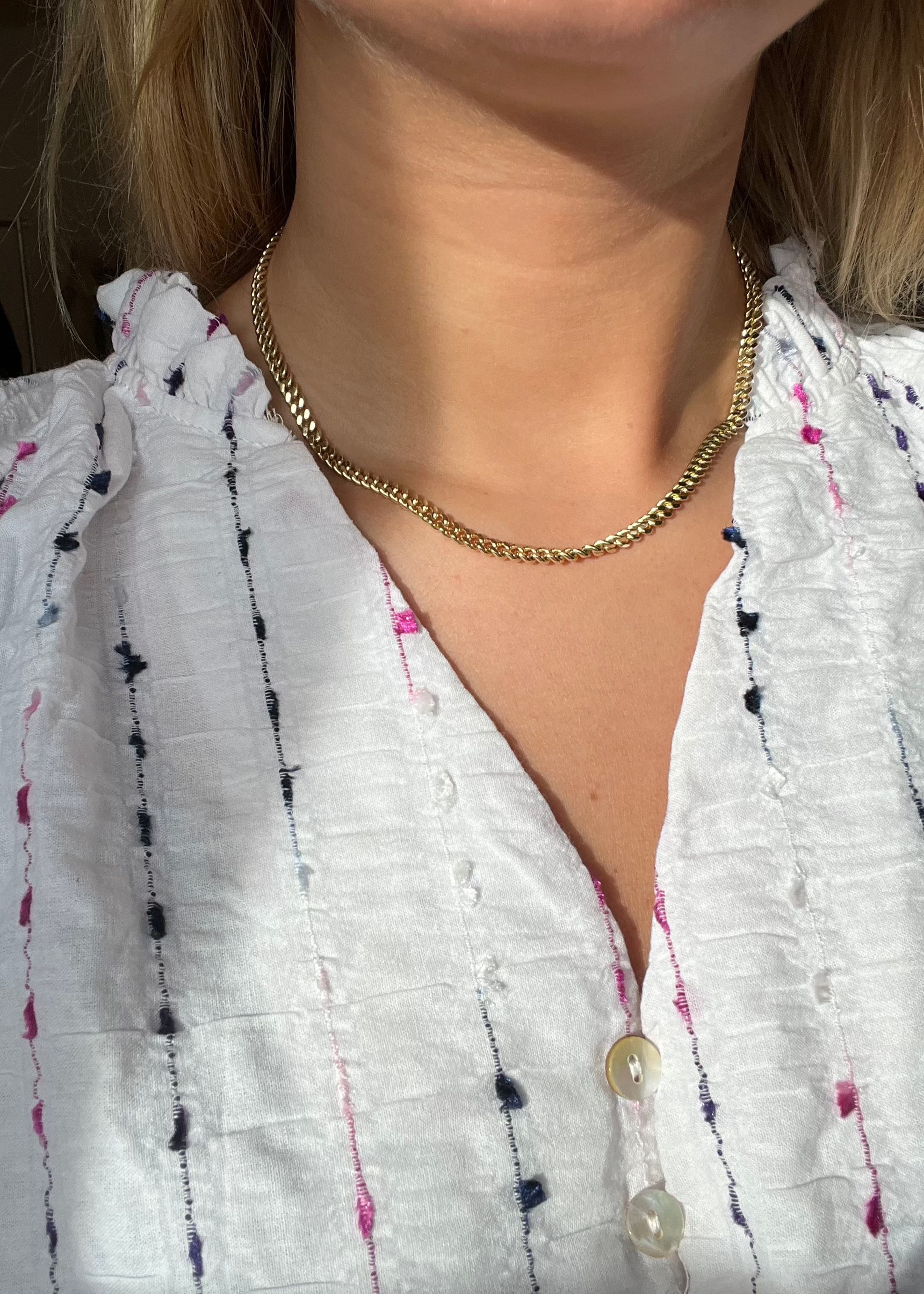 Vår vackra Isabella Dress har inbyggda shorts och de finaste detaljerna. Klänningen är vit med tunna ränder i färger och en kort volangkrage som går ner i en smal v-ringning. Dessutom har den ett resårband i midjan och knappar på toppen💖