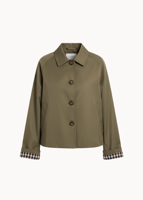 Vores nye Elora Short Trench er en kort frakke i beige med et afslappet, boxy fit. Jakken har knaplukning foran, lommer i siderne og et diskret ternet foer, som kommer til syne ved opsmøgede ærmer. En tidløs klassiker i en moderne version – perfekt til forår og efterår✨🤎