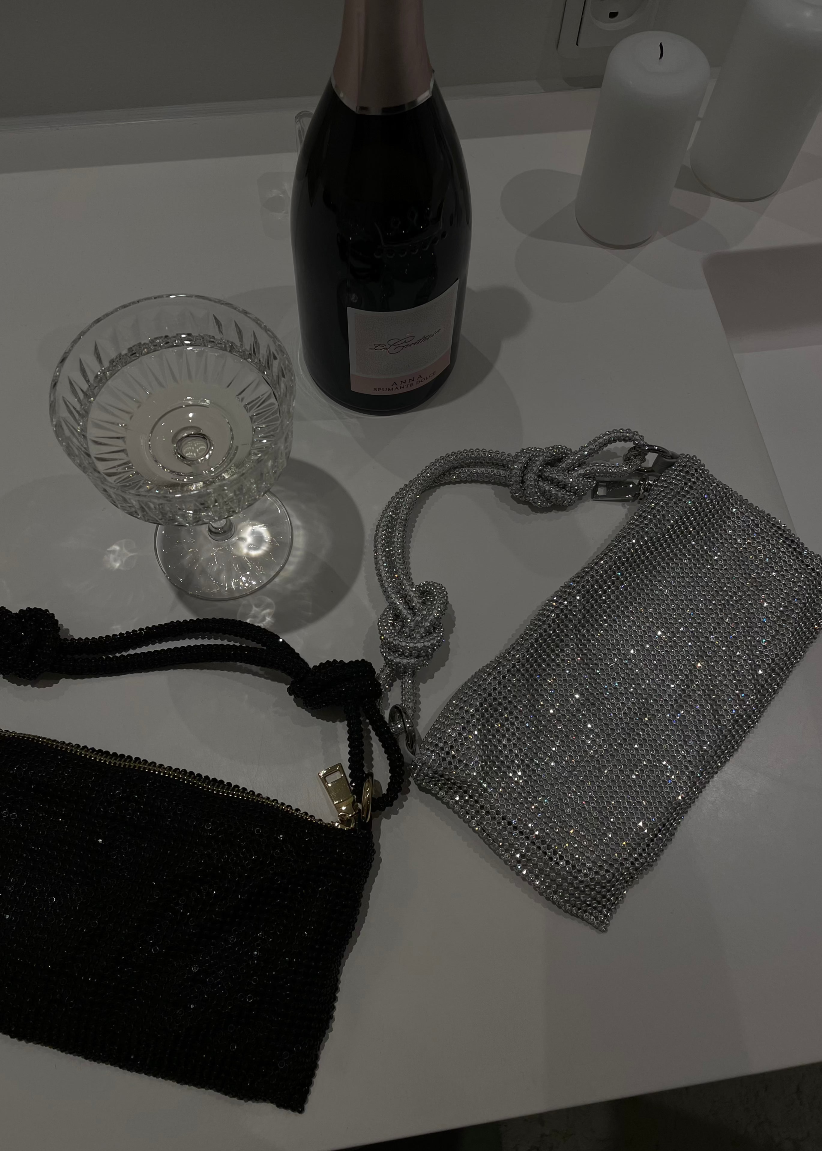 Vår glitterväska är den perfekta lilla handväskan för festliga evenemang. Fylld med gnistrande strass, som skapar en fantastisk glans, och med två eleganta knutar på handtaget. Denna väska är idealisk för nyårsafton eller andra fester, och ger plats för det väsentliga - mobil, läppglans, plånbok, nycklar och det lilla extra✨