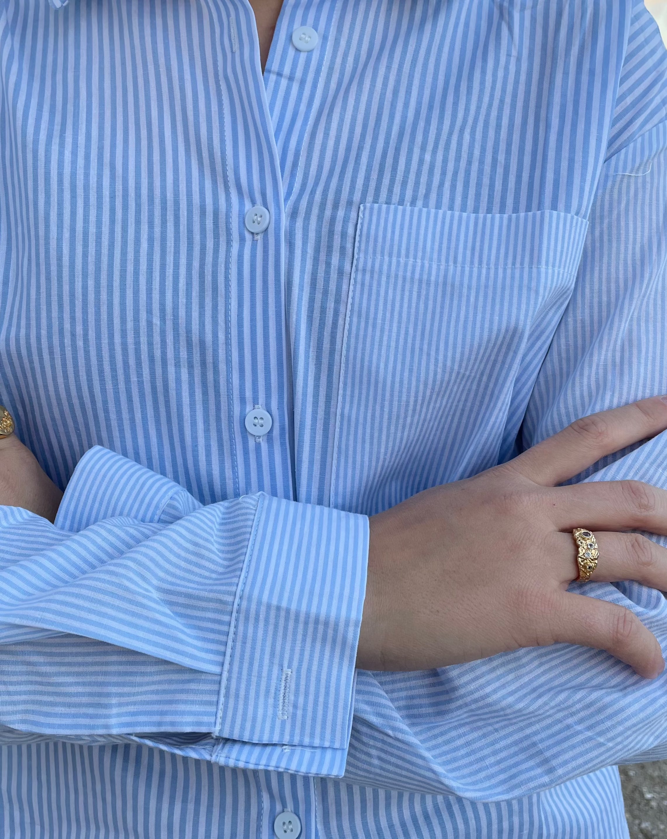 Amalie Shirt är en snygg randig blå skjorta. Skjortan har en liten ficka över ena bröstet och har även en knapp hela vägen ner, så den går att öppna hela vägen upp. Den passar perfekt till ett par coola jeans💙