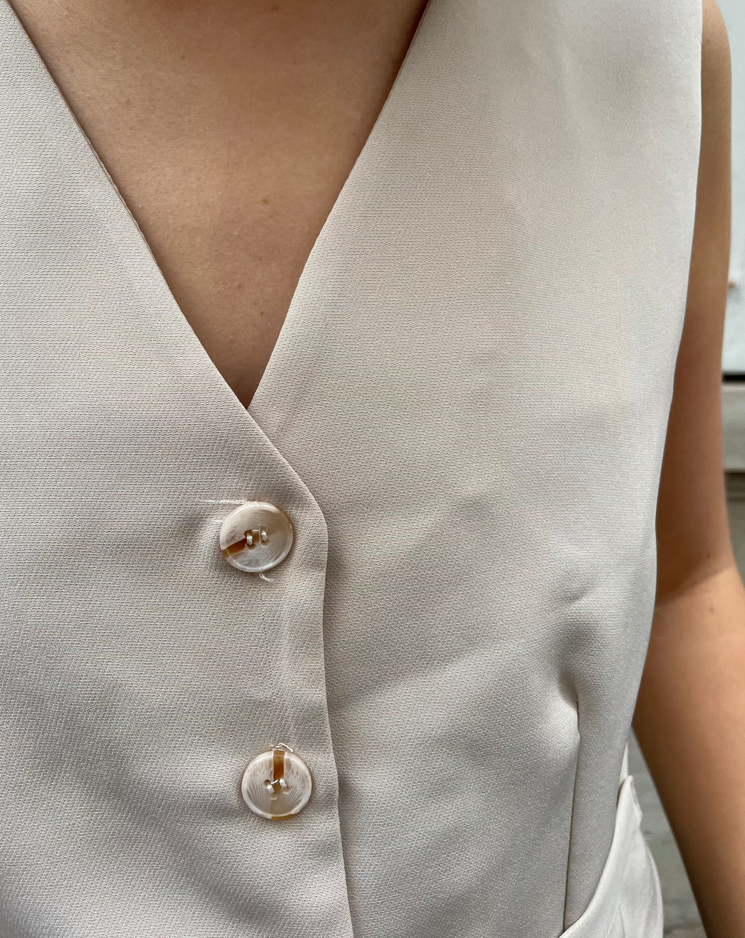 Vår basväst är perfekt för en stilren look för en stadsresa eller fest. Västen har fina detaljer och knappar så att den går att öppna helt. Västen kan stylas med bara armar eller med en t-shirt tillsammans med ett par jeans eller med våra populära linnebyxor🤎