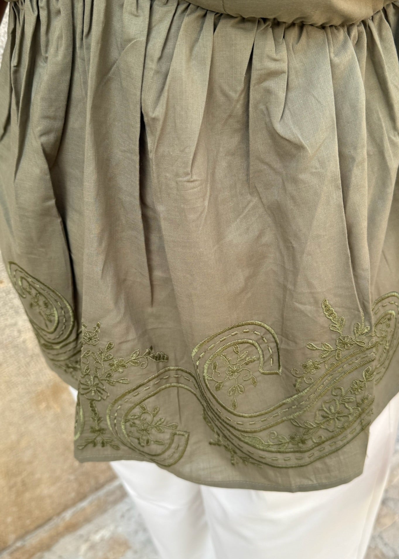 Vår Sophia Top är en lätt, kort sommartopp i 100 % bomull 🌼 Den har feminina spaghettiband och en V-ringning. Toppen är dekorerad med fina broderidetaljer nedtill och vacker spets vid bröstet.
