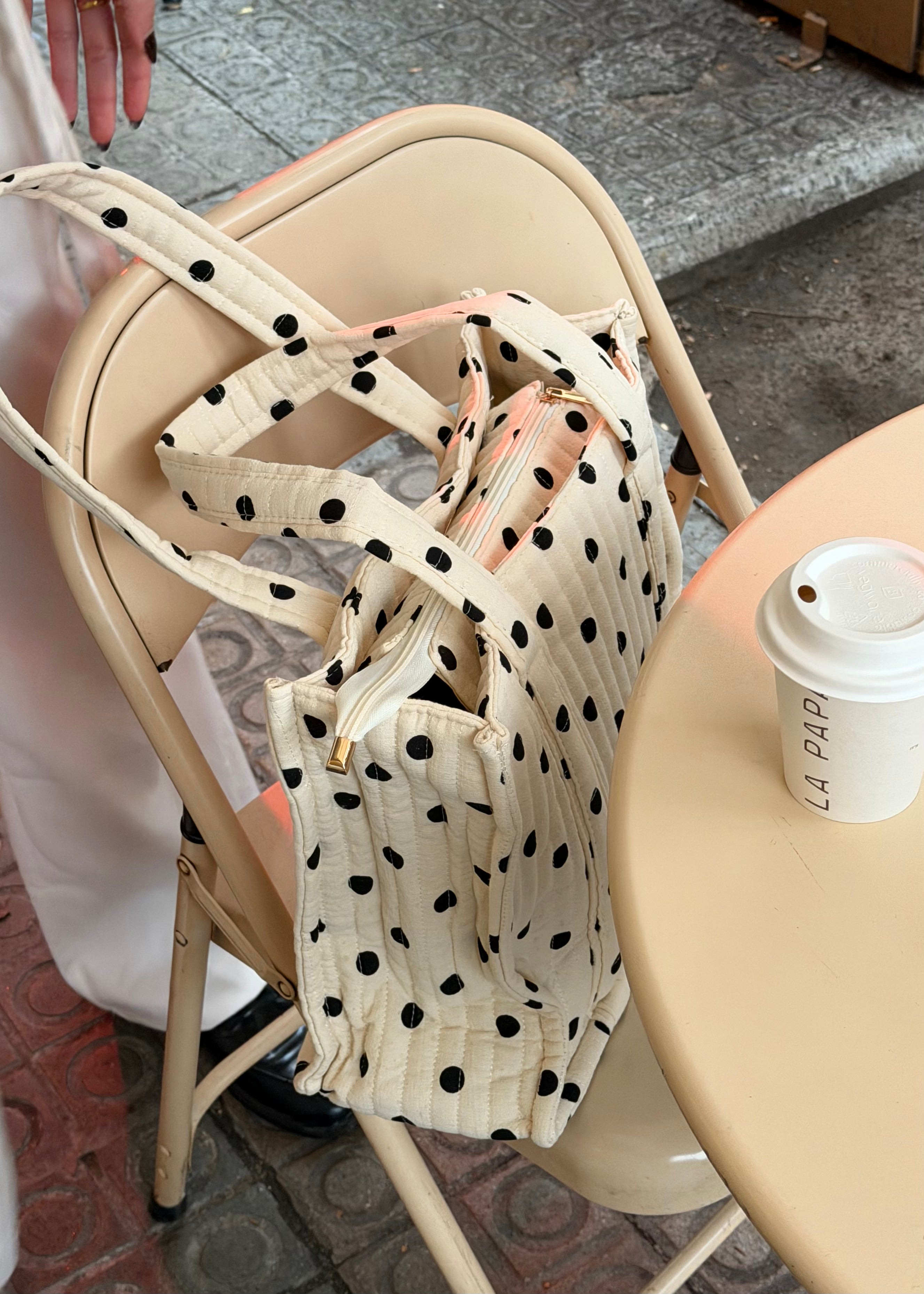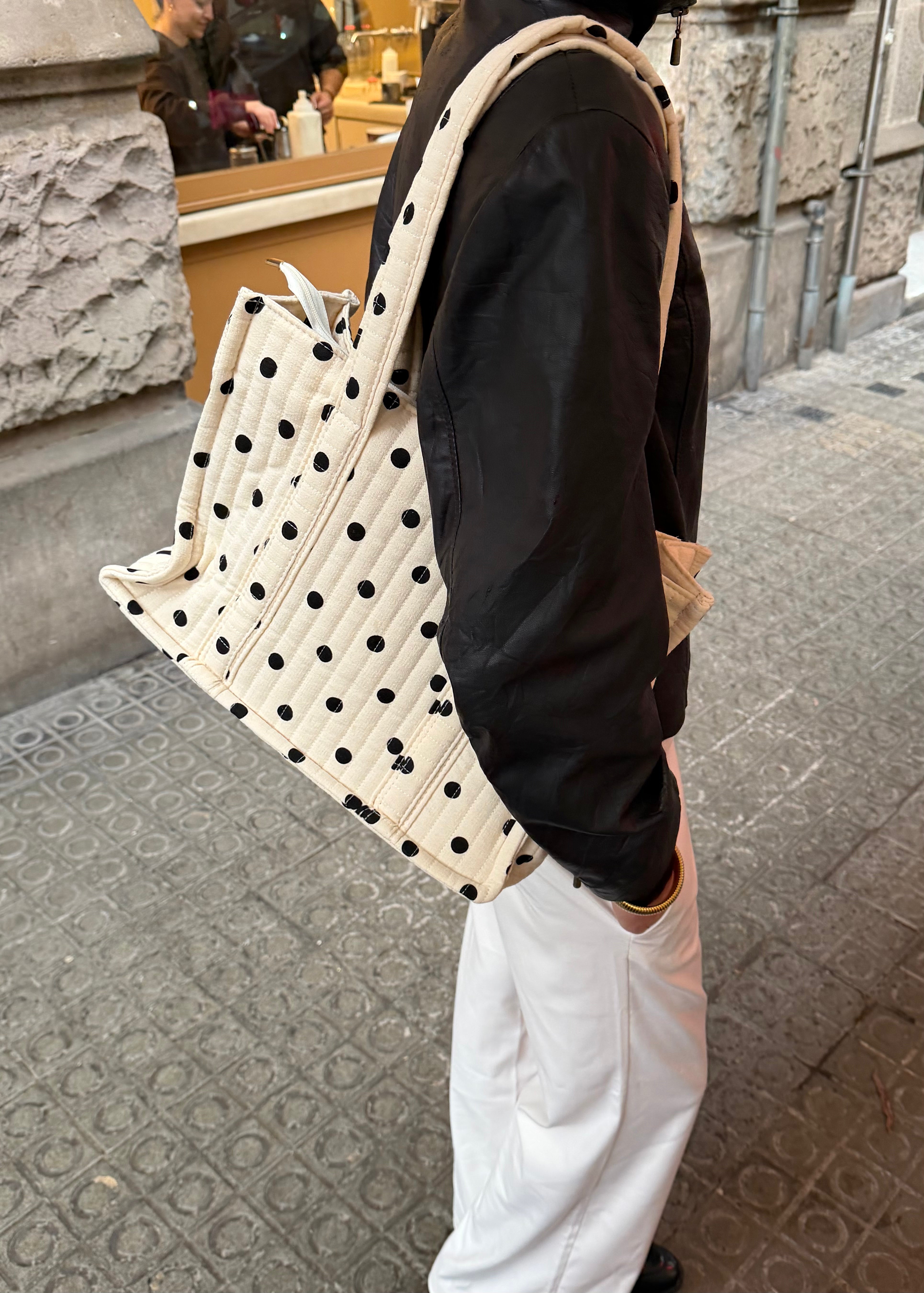 Vores Laura Prikket Net er en klassisk og rummelig stoftaske i 100 % bomuld, perfekt til forårs- og sommersæsonen. Tasken har et tidløst sort polkaprint, som giver et fint og sommerligt udtryk, der er nemt at style til både hverdag og ferie.