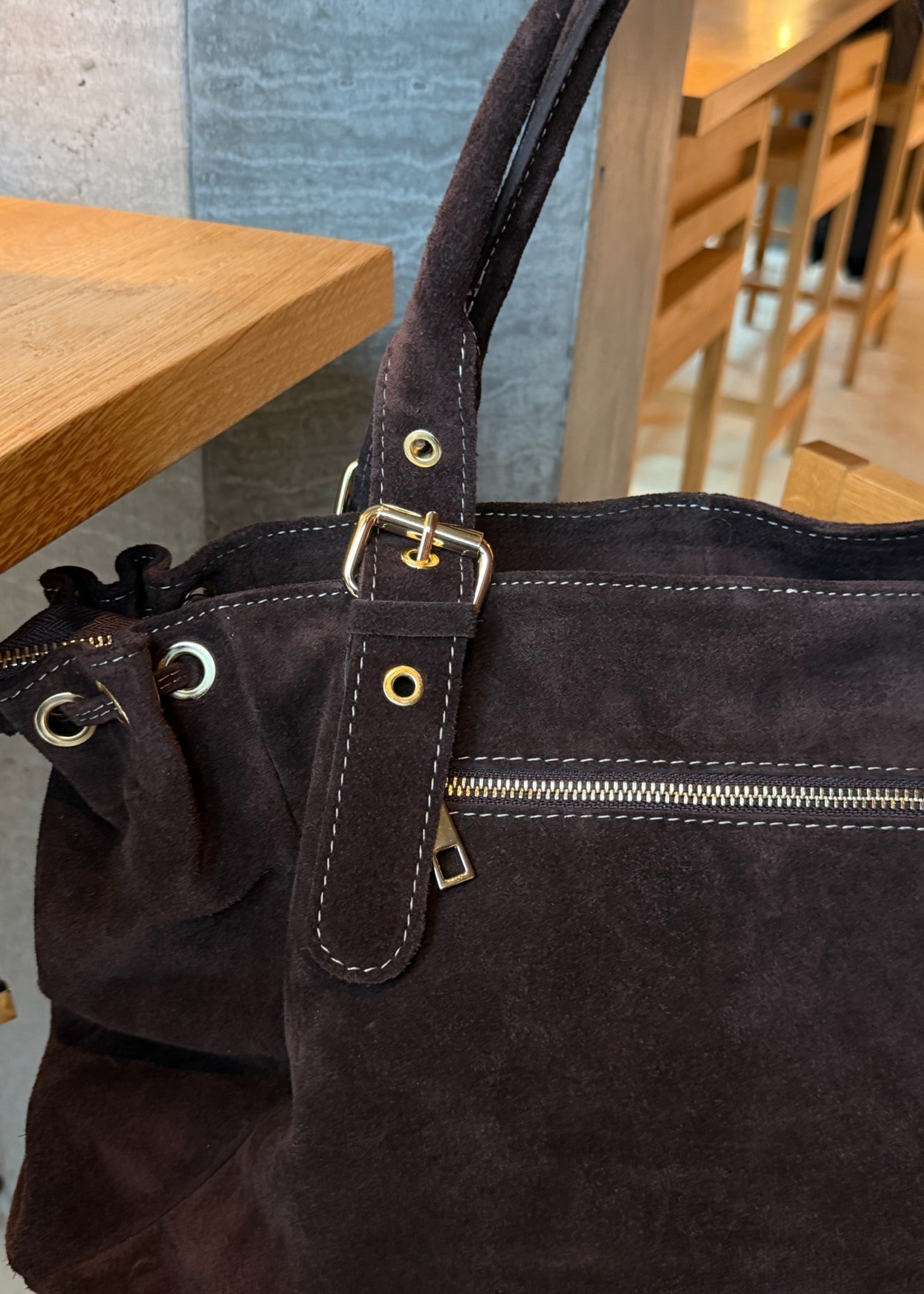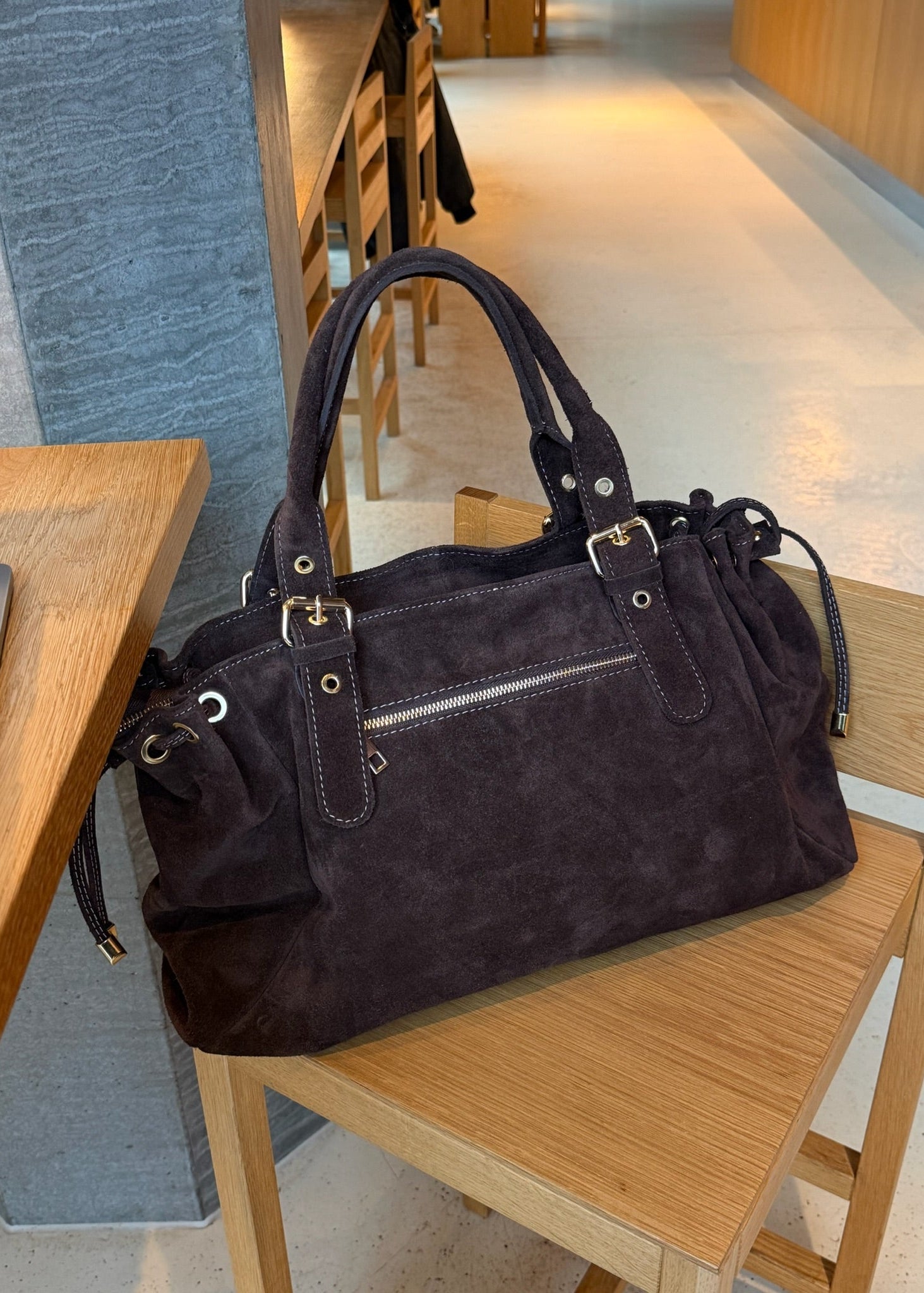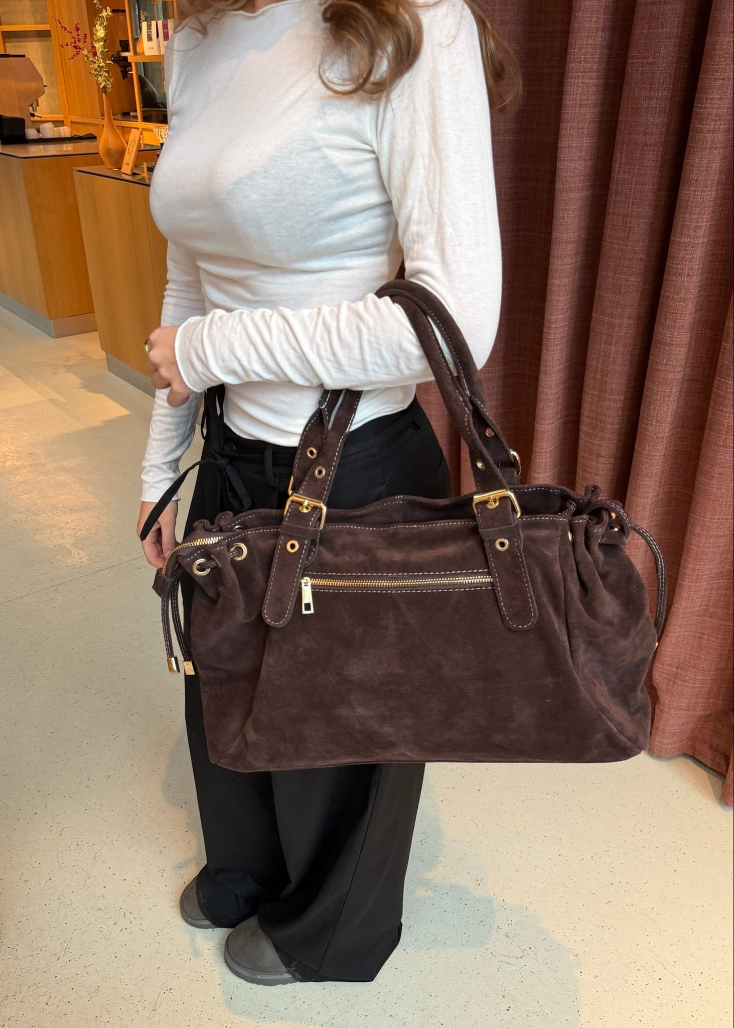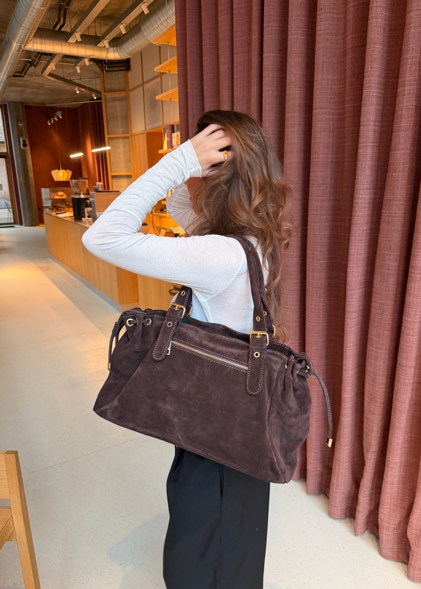 London Tasken i Ruskind er en elegant skuldertaske fremstillet i 100 % ægte ruskind 🤎💫 Tasken har justerbare stropper og kan strammes ind i siderne, så formen nemt kan tilpasses efter behov.