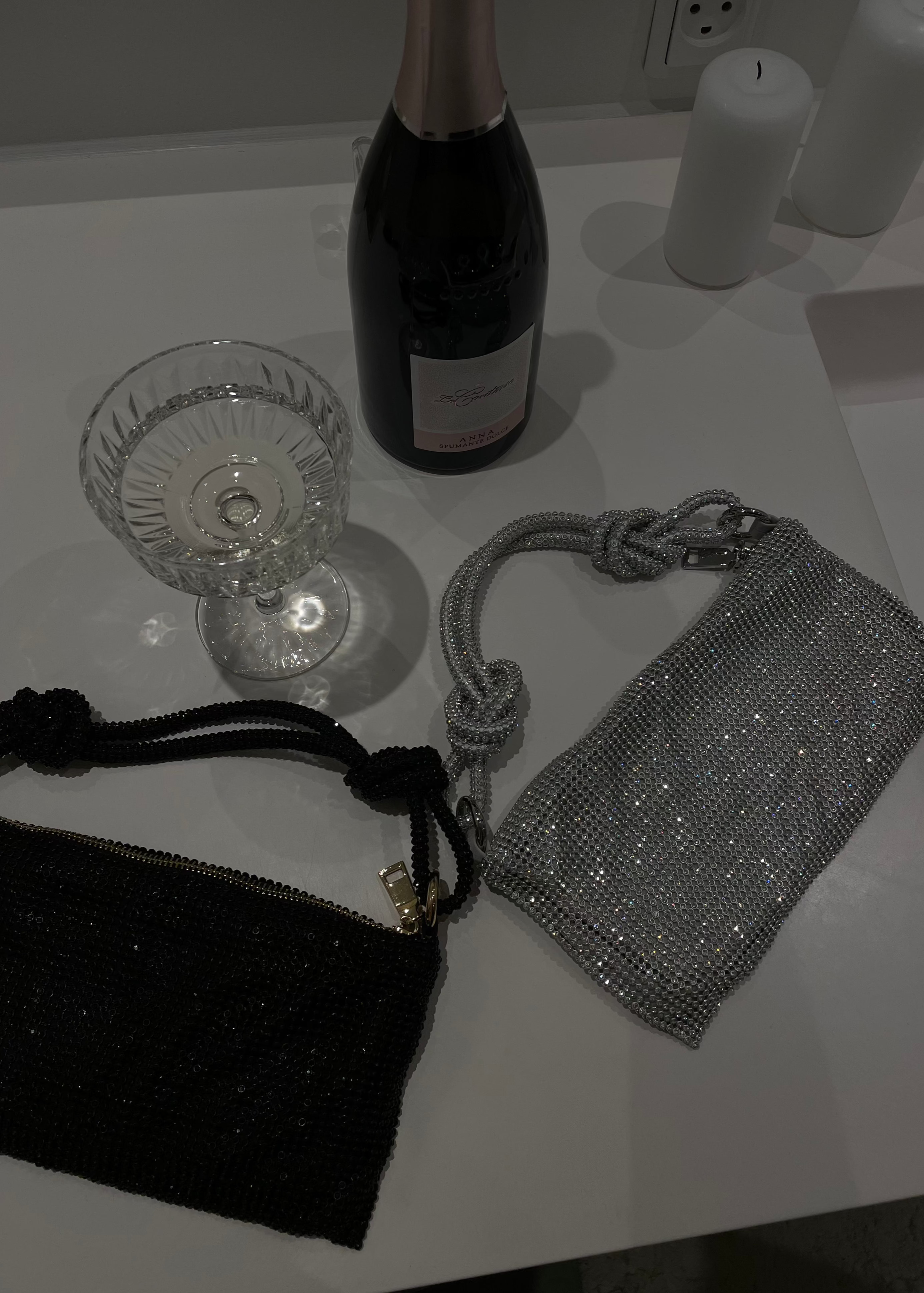 Vår glitterväska är den perfekta lilla handväskan för festliga evenemang. Fylld med gnistrande strass, som skapar en fantastisk glans, och med två eleganta knutar på handtaget. Denna väska är idealisk för nyårsafton eller andra fester, och ger plats för det väsentliga - mobil, läppglans, plånbok, nycklar och det lilla extra✨