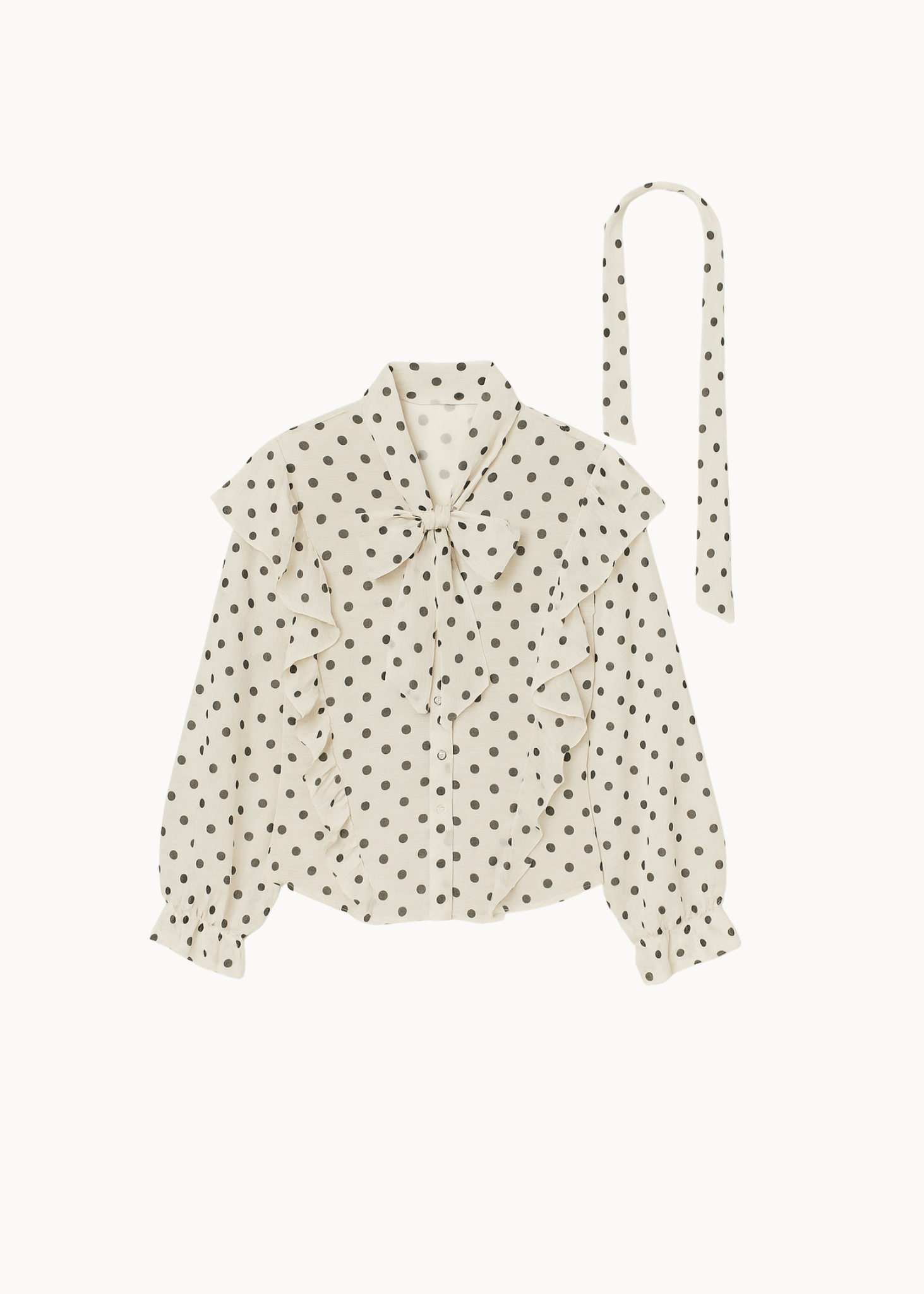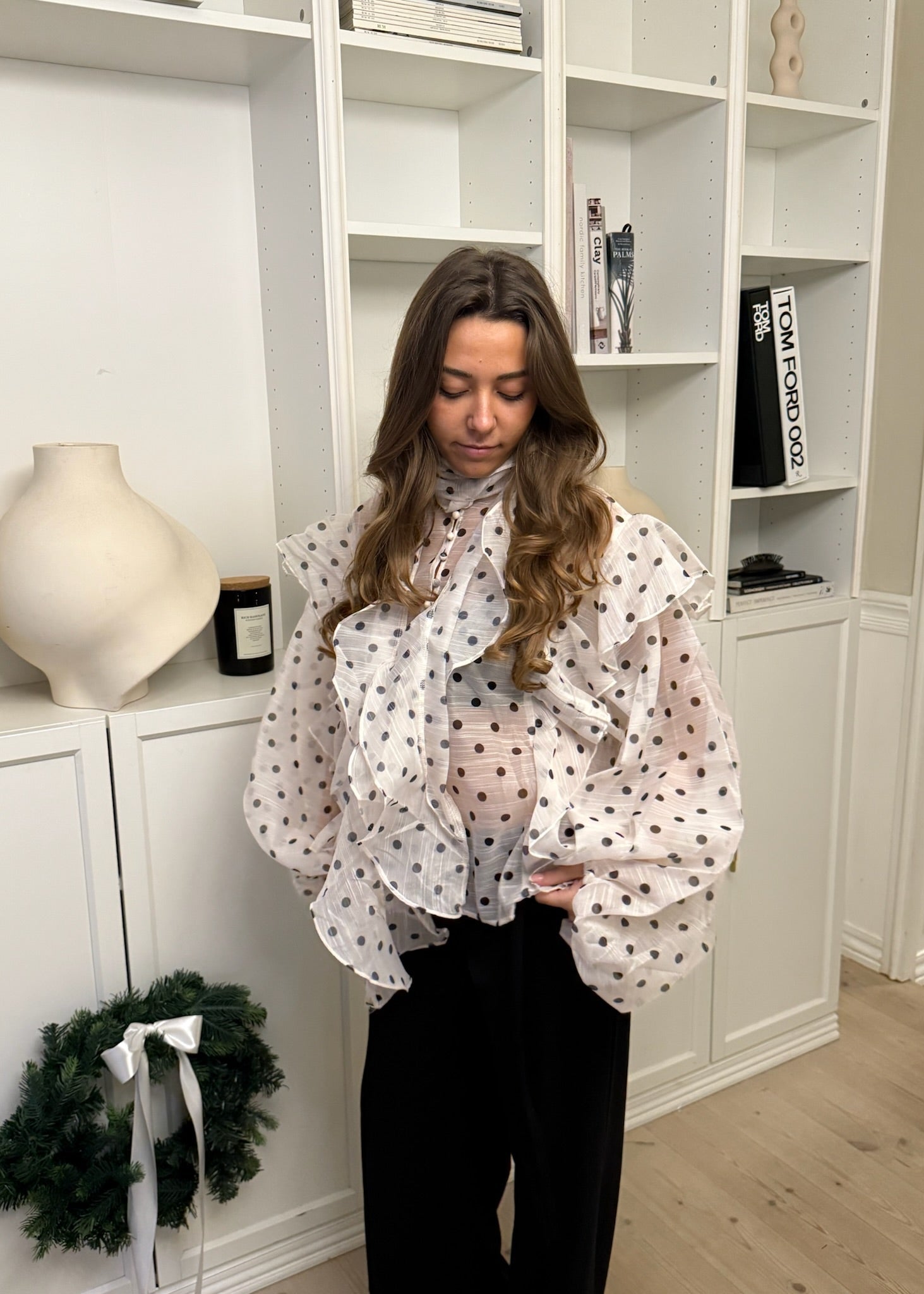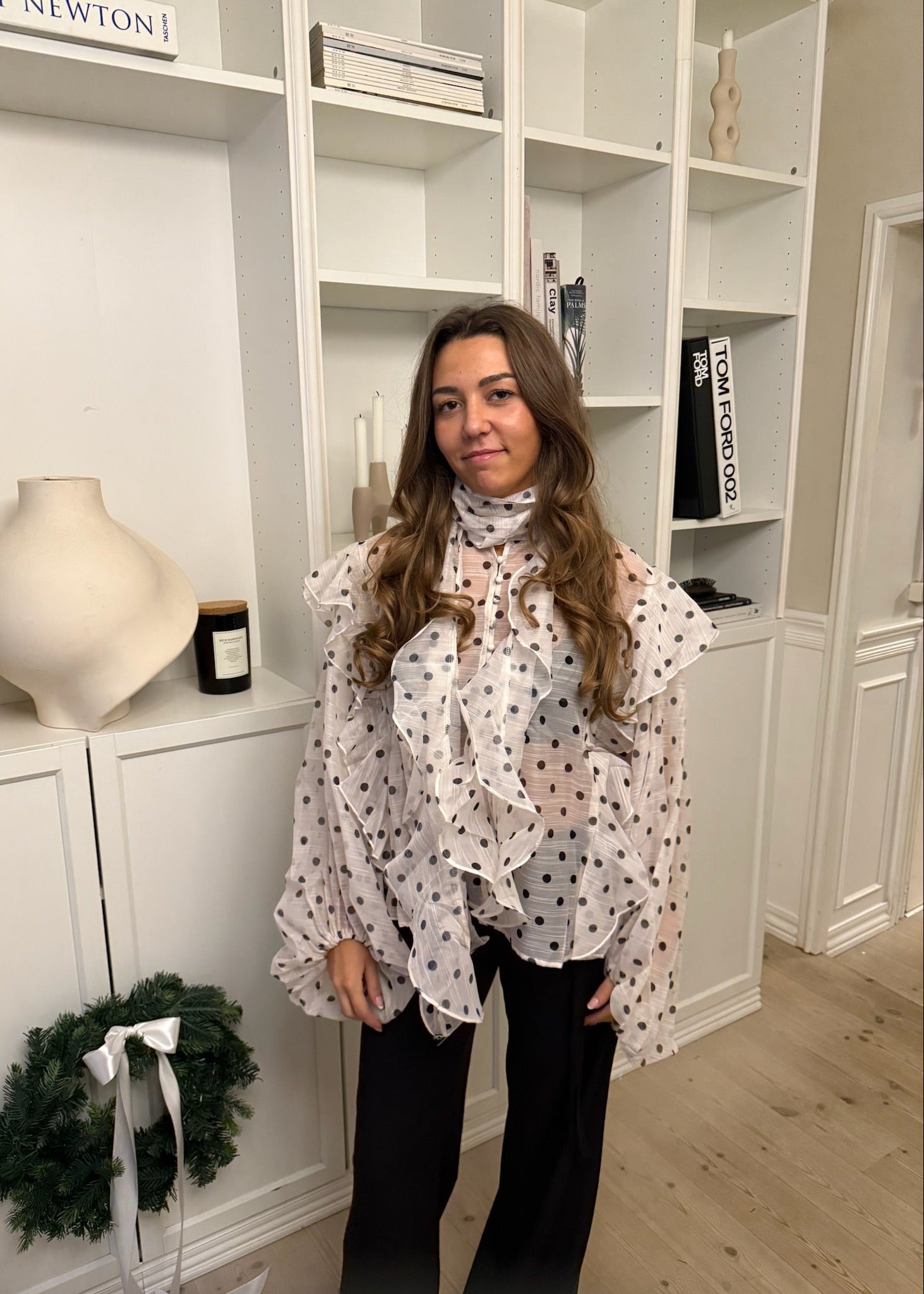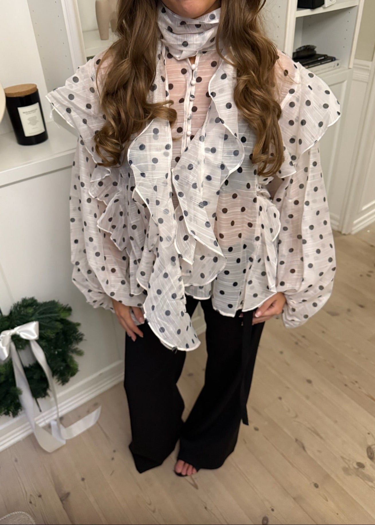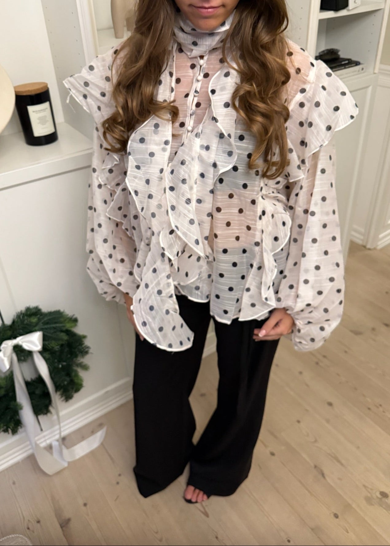 Vores Belle Polka Skjorte er en feminin og elegant fortolkning af den klassiske skjorte. Den er designet med et smukt prikket mønster og fine flæsedetaljer, der giver et romantisk udtryk. Skjorten har en aftagelig sløjfe ved halsen, så du nemt kan style den både sofistikeret og afslappet. De let puffede ærmer og bløde stof giver et flatterende fald og et eksklusivt look - perfekt til både hverdag og festlige anledninger✨