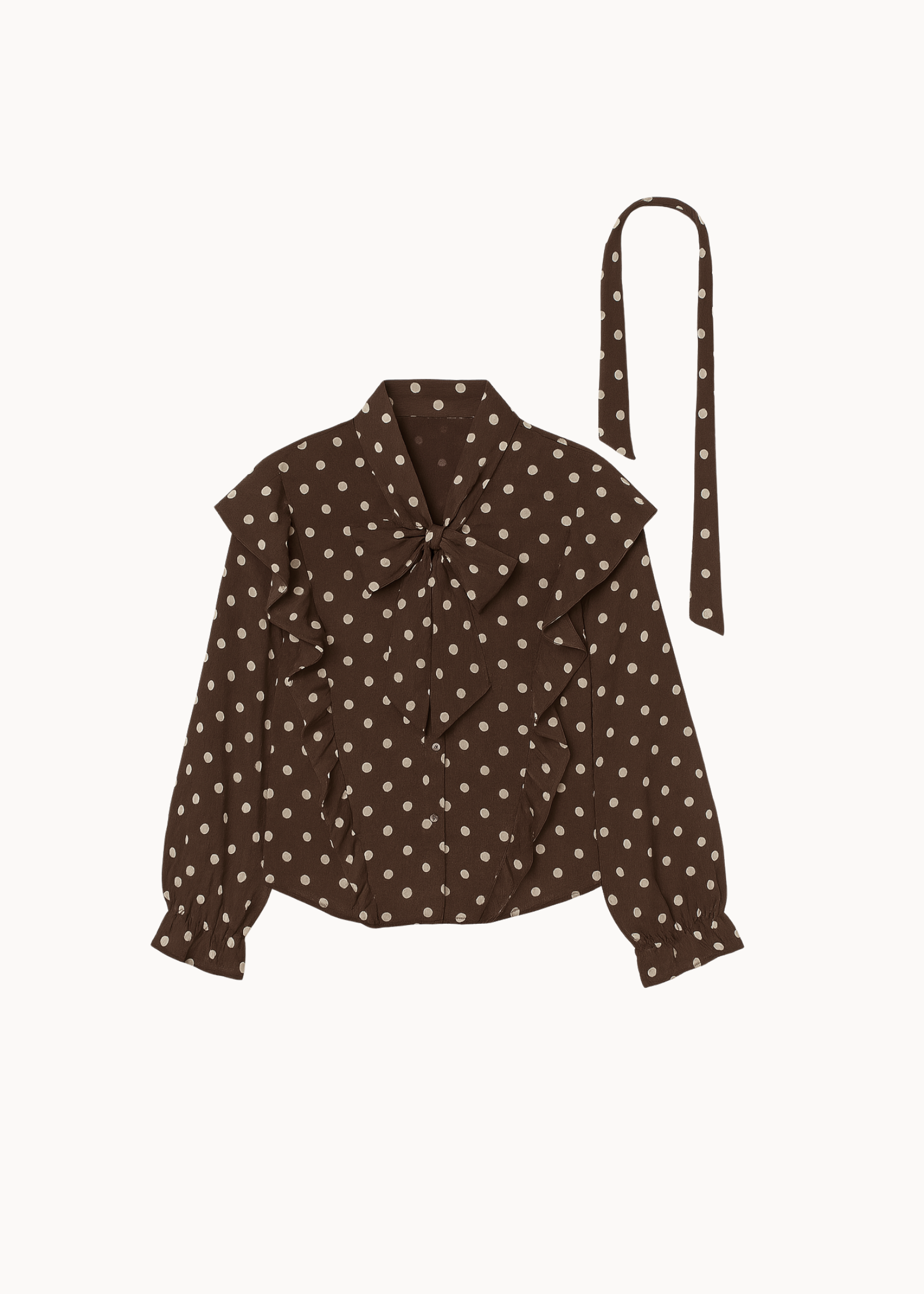 Vores Belle Polka Skjorte er en feminin og elegant fortolkning af den klassiske skjorte. Den er designet med et smukt prikket mønster og fine flæsedetaljer, der giver et romantisk udtryk. Skjorten har en aftagelig sløjfe ved halsen, så du nemt kan style den både sofistikeret og afslappet. De let puffede ærmer og bløde stof giver et flatterende fald og et eksklusivt look - perfekt til både hverdag og festlige anledninger✨
