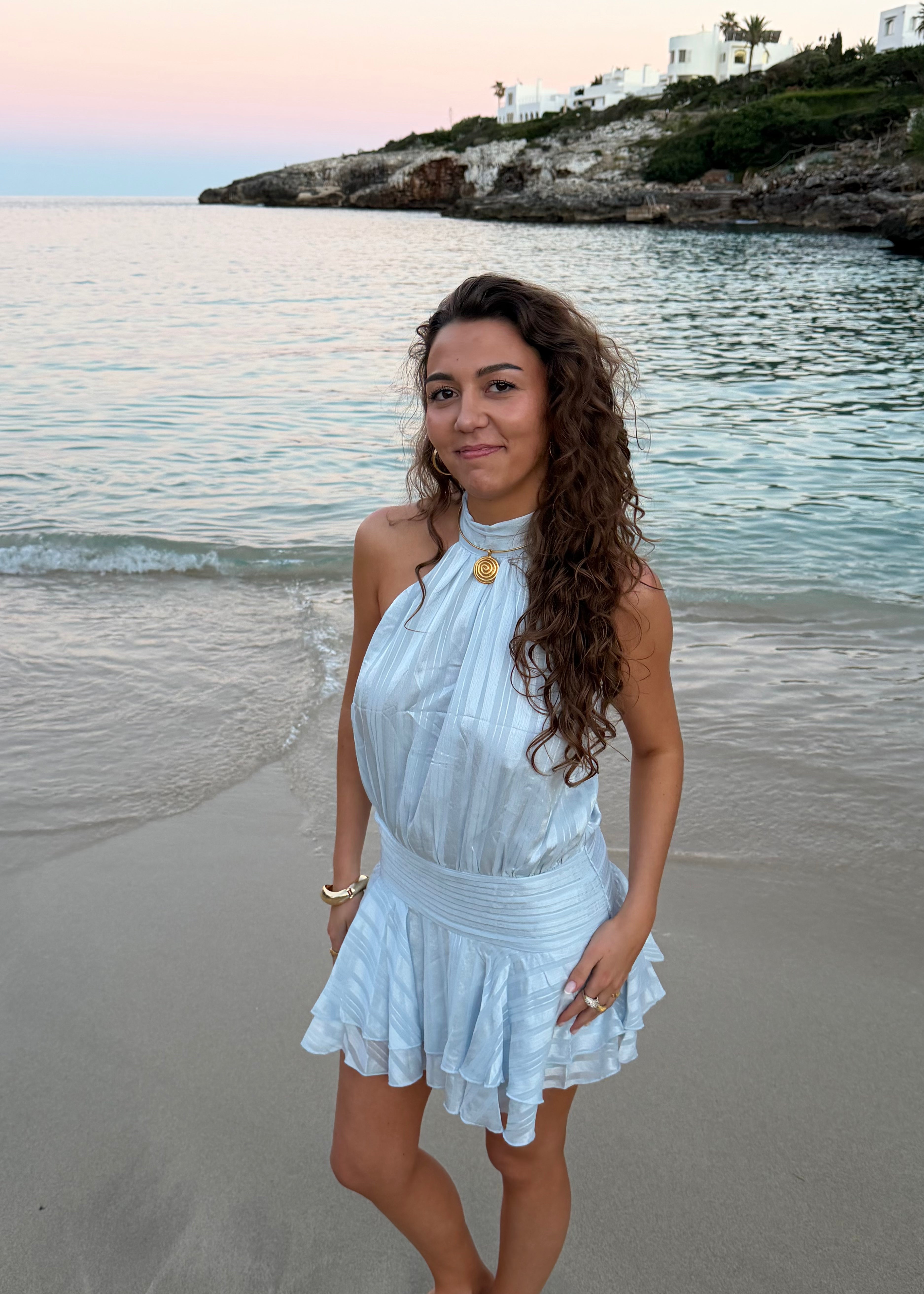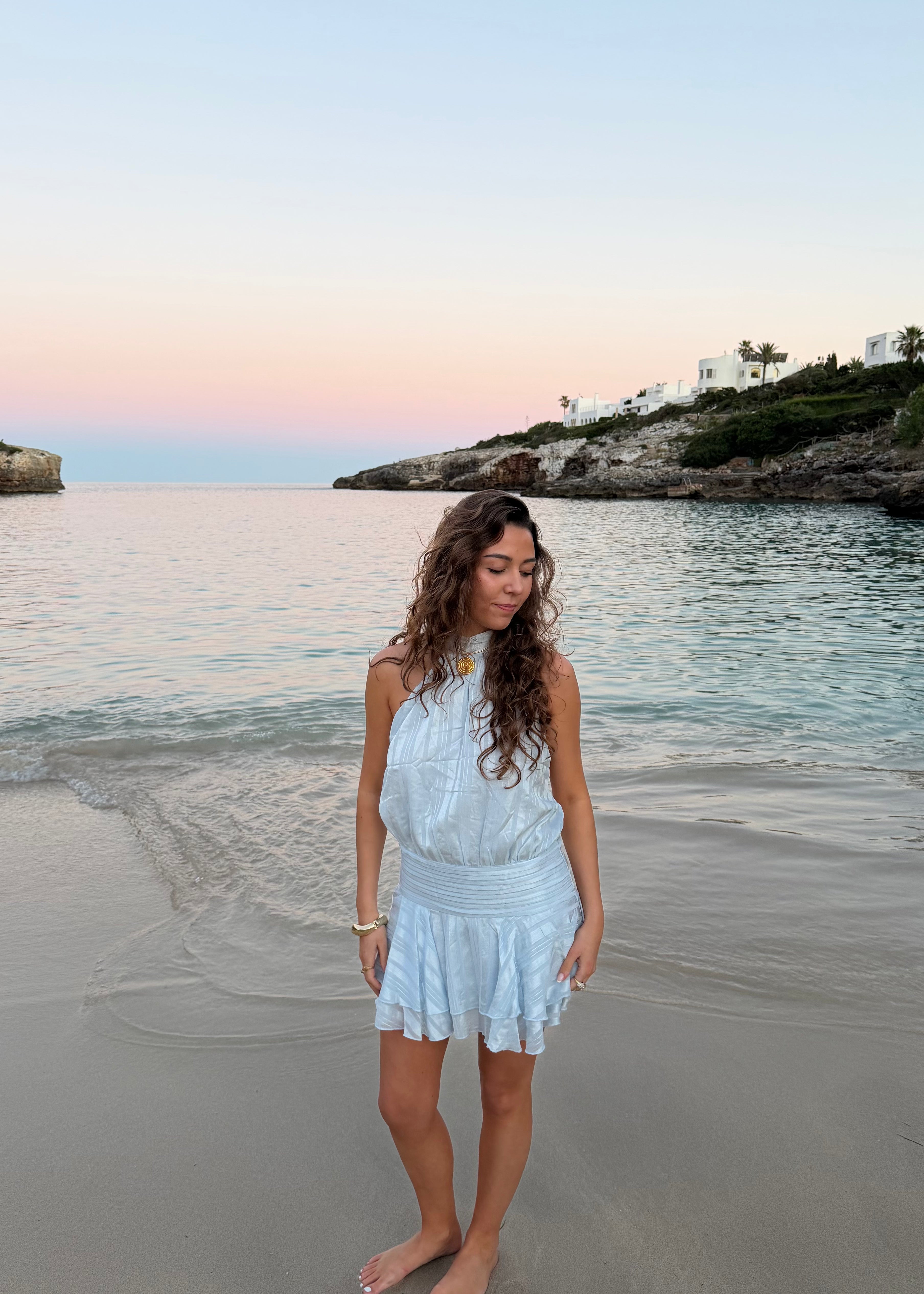 Nora Flair Mini Kjole er en elegant og feminin kjole designet i en smuk satin-look kvalitet med diskret stribet struktur. Den har halterneck-lukning, en løs og draperet overdel samt en markeret talje, der skaber en smigrende silhuet. Nederdelen består af to lag, som giver et let og festligt fald og skaber smuk bevægelse✨