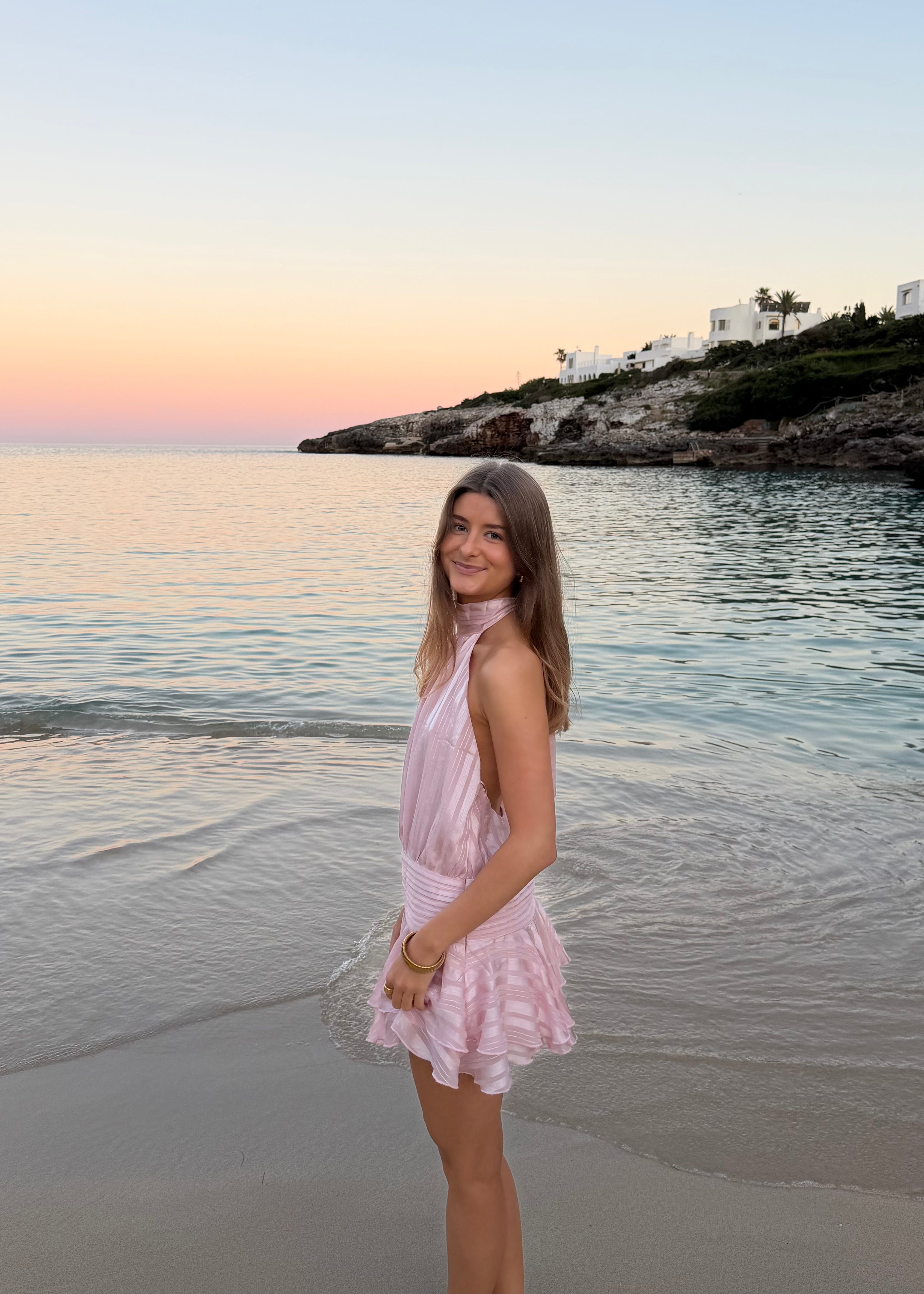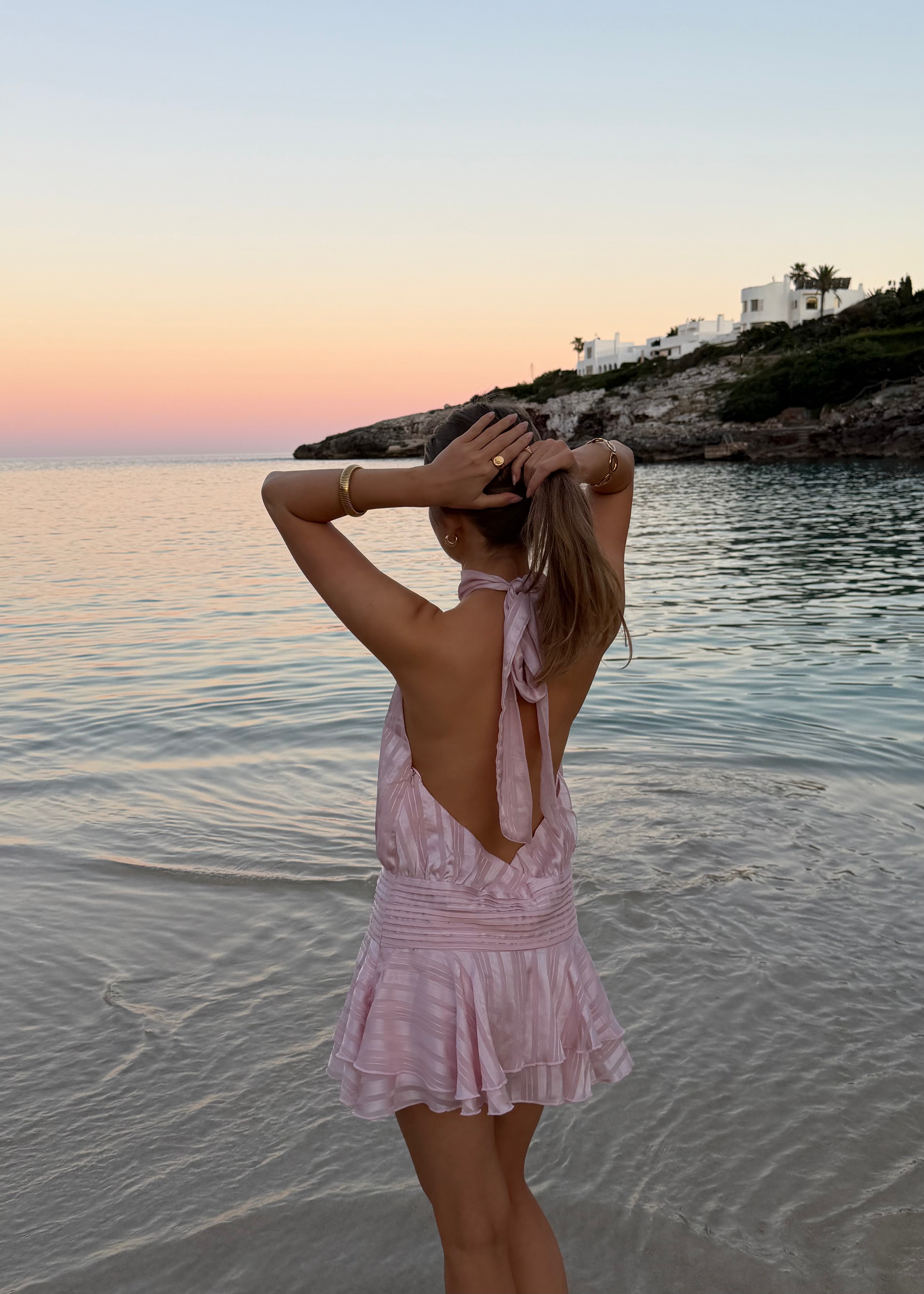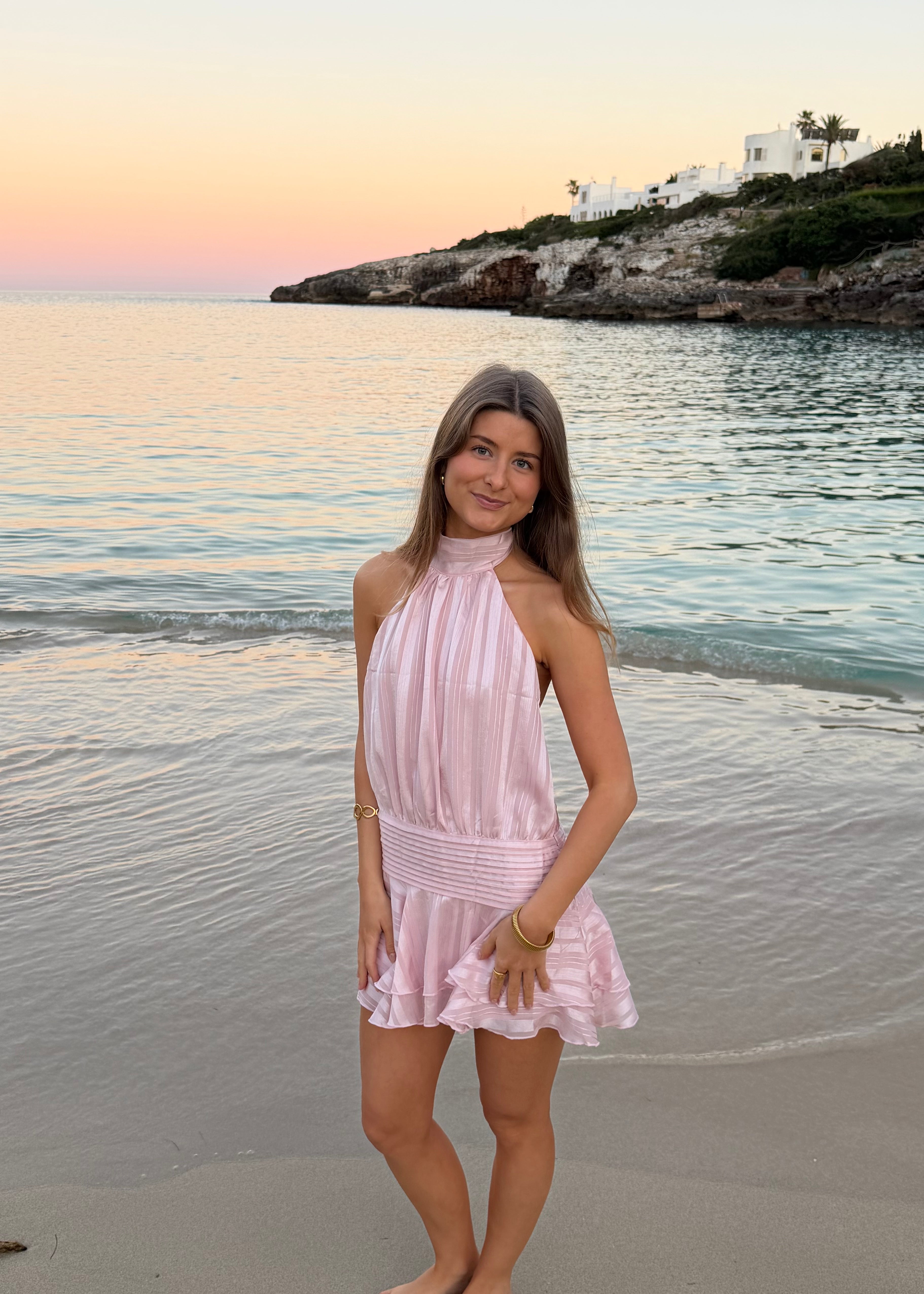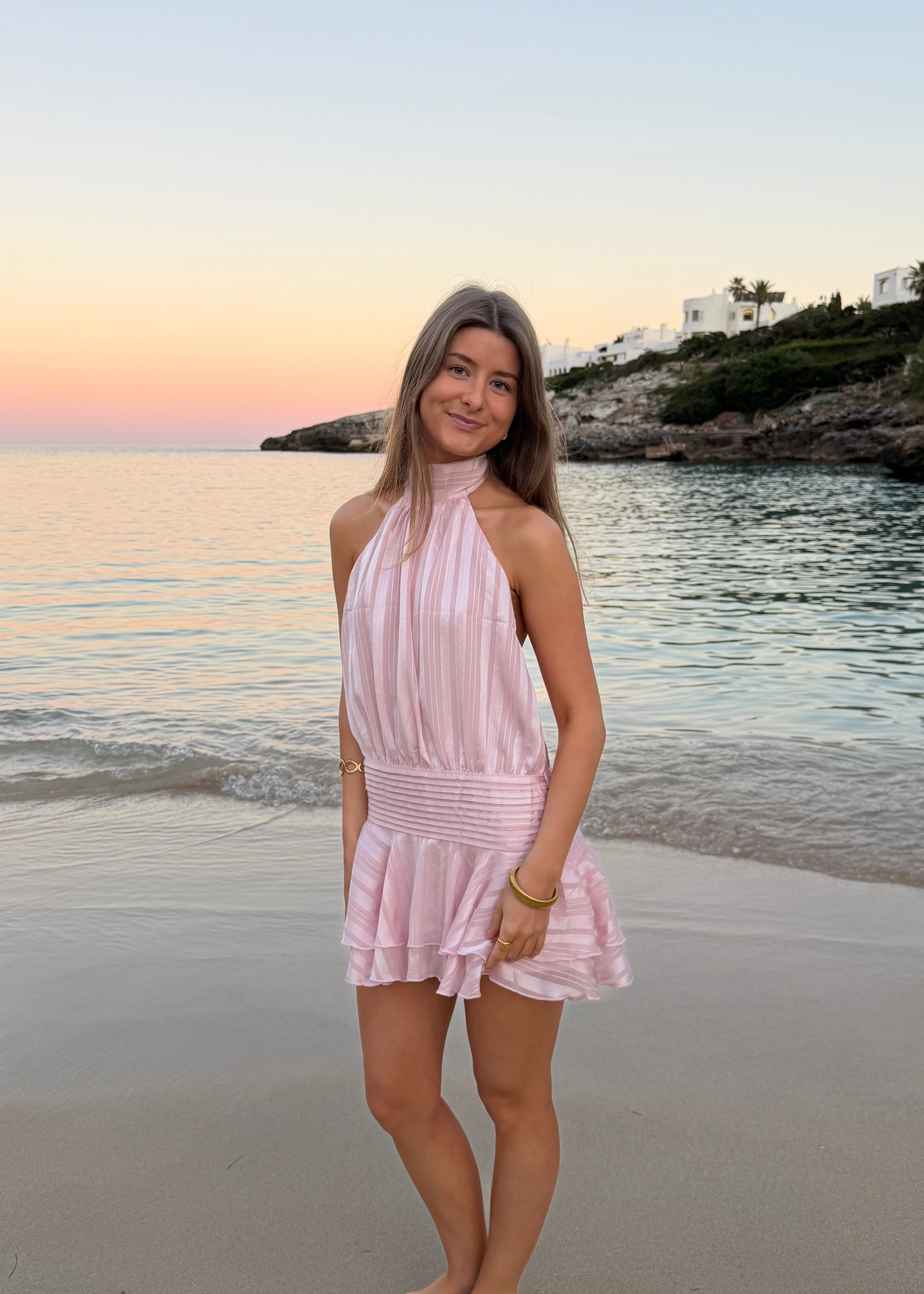Nora Flair Mini Kjole er en elegant og feminin kjole designet i en smuk satin-look kvalitet med diskret stribet struktur. Den har halterneck-lukning, en løs og draperet overdel samt en markeret talje, der skaber en smigrende silhuet. Nederdelen består af to lag, som giver et let og festligt fald og skaber smuk bevægelse✨