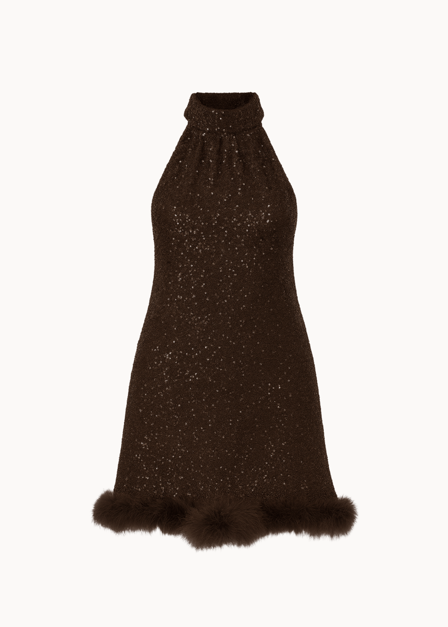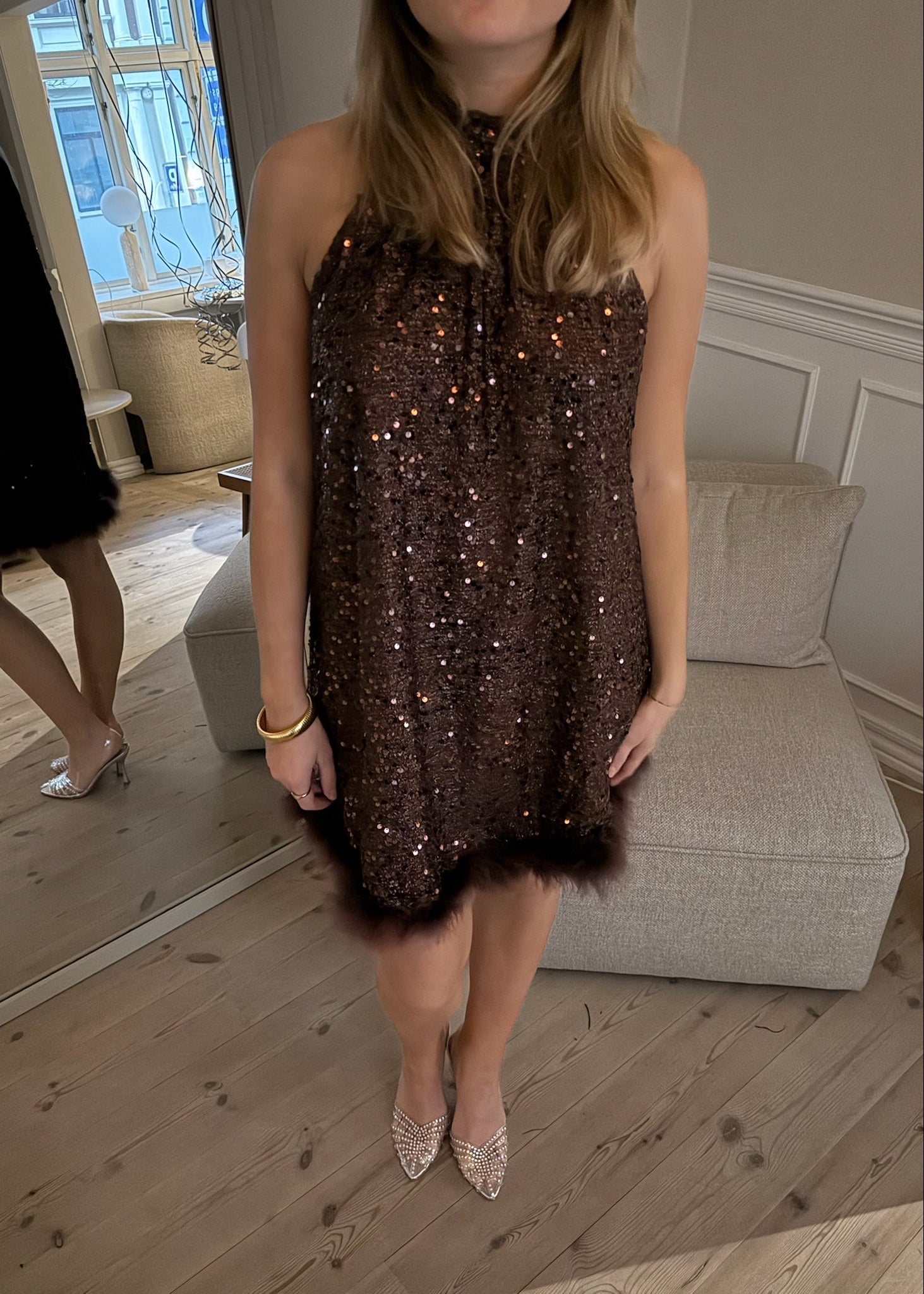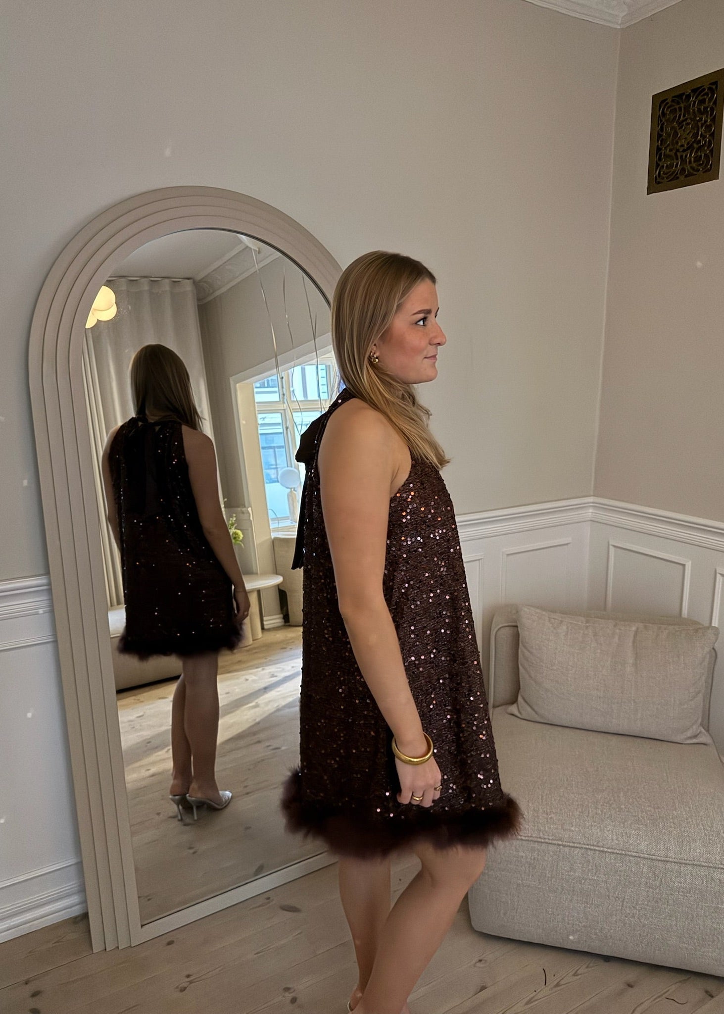 Vår Thea Sequin Dress är den perfekta festklänningen, fylld med gnistrande paljetter. Klänningen har en elegant halterneck och en vacker rygg som stängs med ett band i nacken, vilket skapar en snygg rosett. Klänningen är prydd med lyxiga fjädrar nertill, och dess lösare passform, som träffar precis ovanför knäet, ger den en lätt look🎀✨