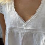 Vår Vilja-topp är ärmlös med små fransar vid ärmkanterna och har en djup V-ringning med en fin spetskant. Baksidan är prydd med vacker spets med en smal öppning som ger ett elegant, öppet utseende. Tillverkad av 100% bomull med ett böljande och bekvämt snitt💛